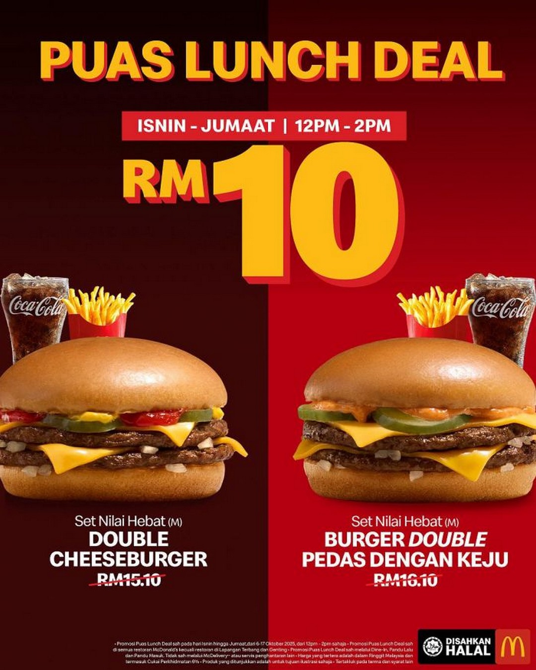 Looking for a lunch option that is both satisfying and easy on the wallet? McDonald’s Malaysia has rolled out a deal that will surely excite anyone who enjoys a hearty midday meal without overspending. From 6 to 17 October 2025, McDonald’s is offering their RM10 Puas Lunch Deal, available every weekday from 12 PM to 2 PM. This is the perfect opportunity for those looking to enjoy classic McDonald’s favourites like the Double Cheeseburger or the Burger Double Pedas dengan Keju at a price that’s hard to beat.