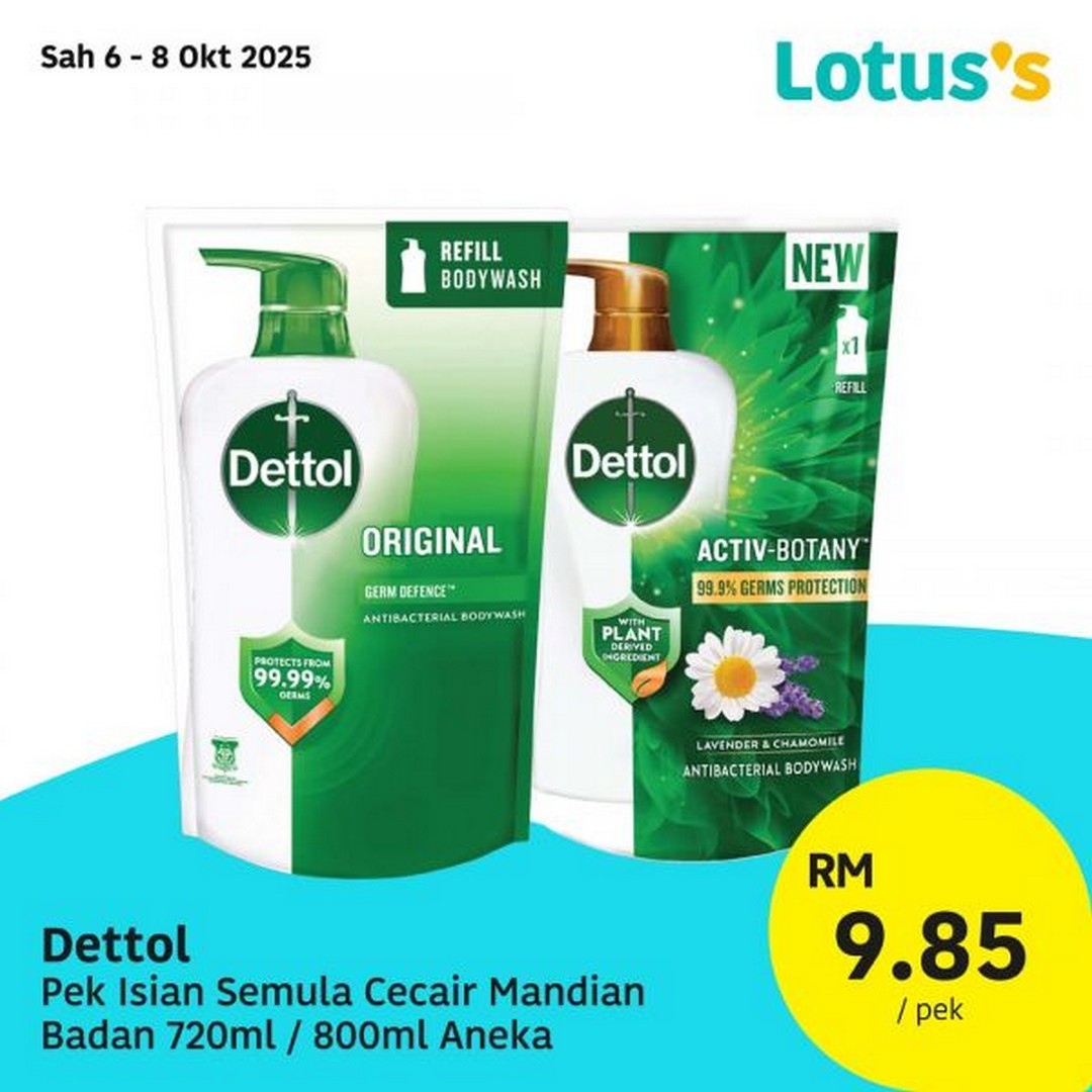 Dettol Bodywash Refill 720ml / 800ml – RM9.85/pack, 6–8 October 2025, Lotus’s Malaysia