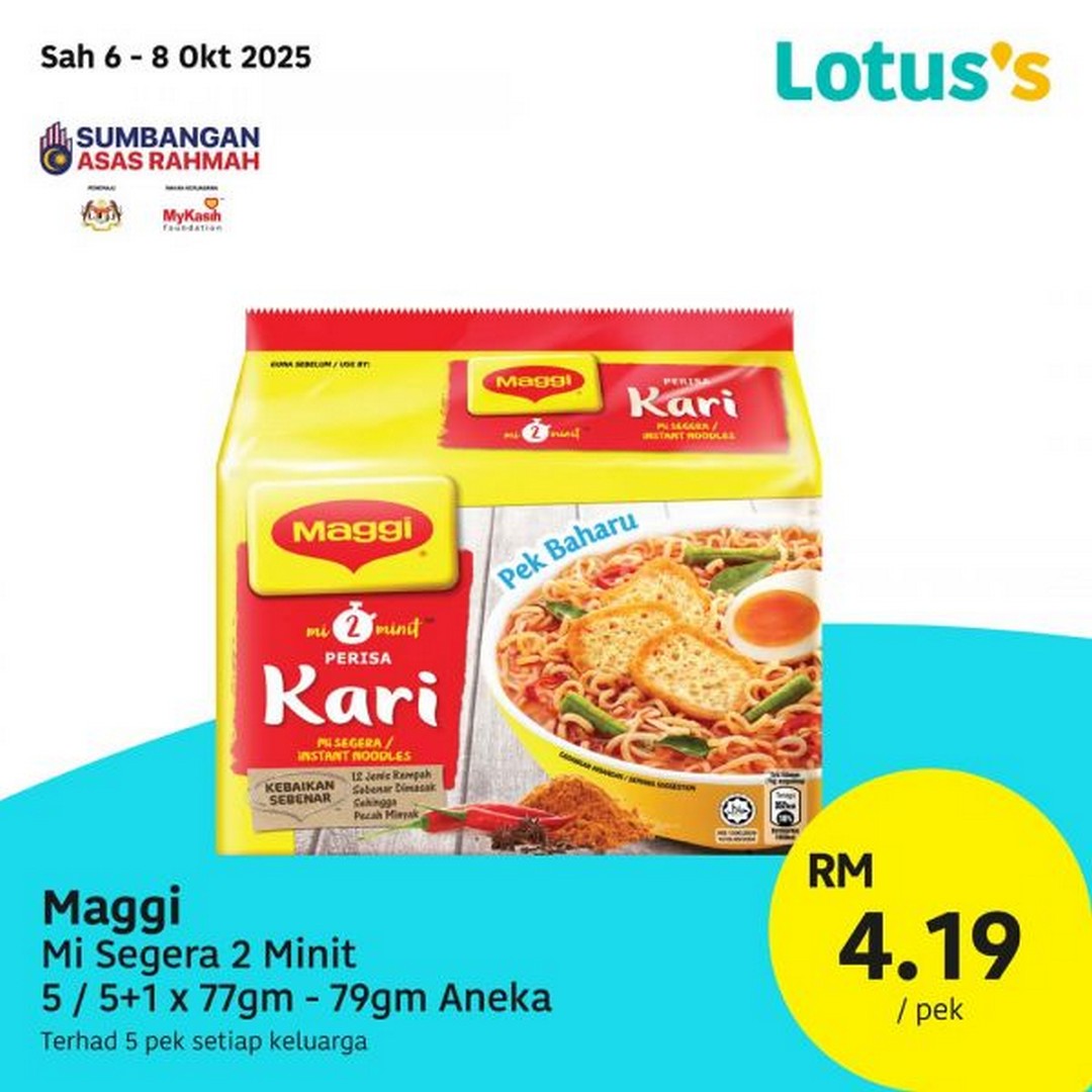 Maggi Mi Segera 2 Minit 5/5+1 x 77–79g – RM4.19/pack, 6–8 October 2025, limit 5 packs per family
