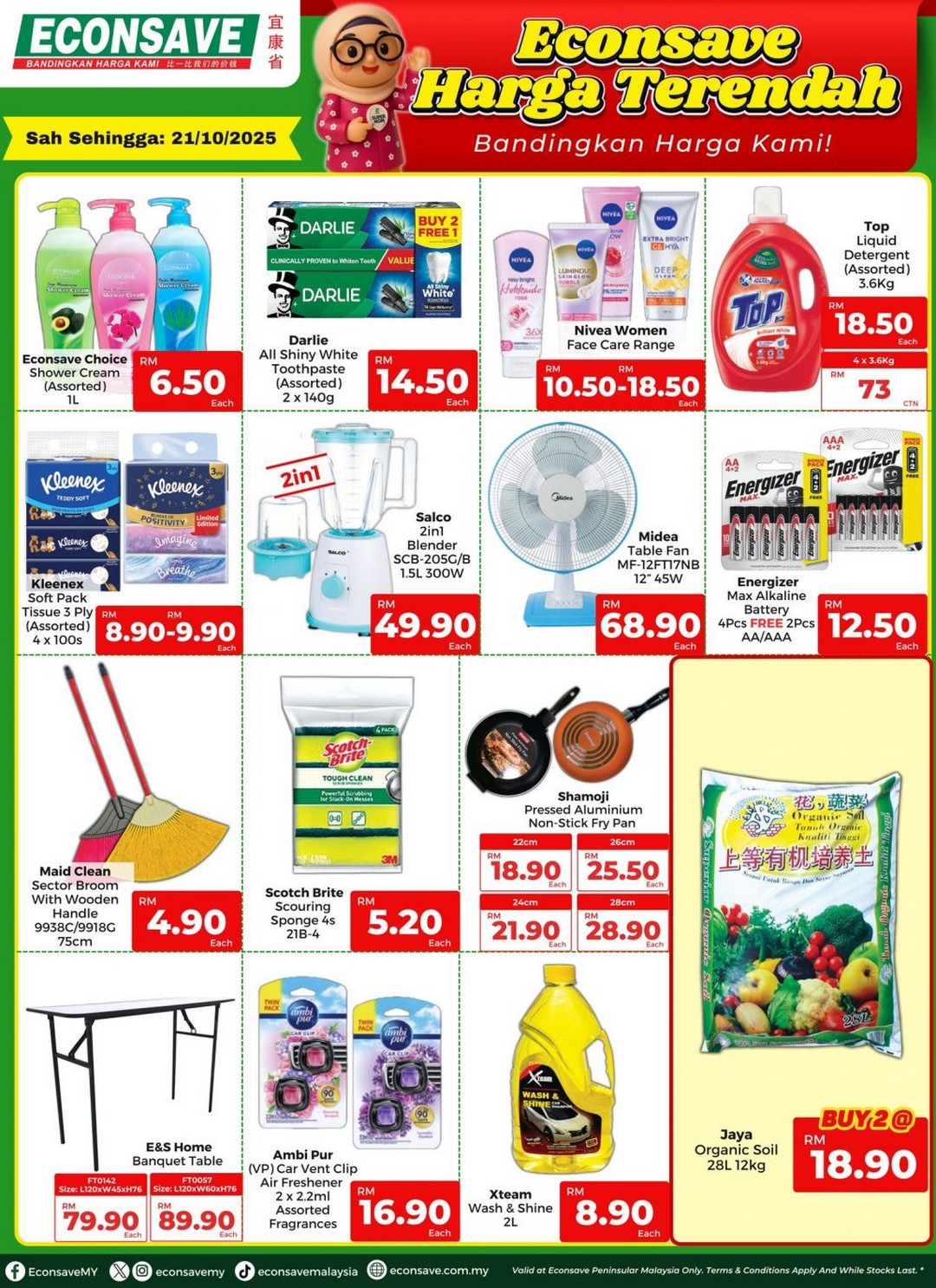 Household essentials are not left out either. Bird’s Custard Powder 300g is priced at RM5.90, and Adabi Serbuk Cili 220g is RM5.40. For personal care, Darlie All Shiny White Toothpaste (2 x 140g) is available at RM14.50. Even for appliances, Econsave offers great bargains such as the Midea Table Fan MF-12FT7N7B for RM68.90 each. These deals provide an excellent opportunity to refresh essential items around the home without paying full price.