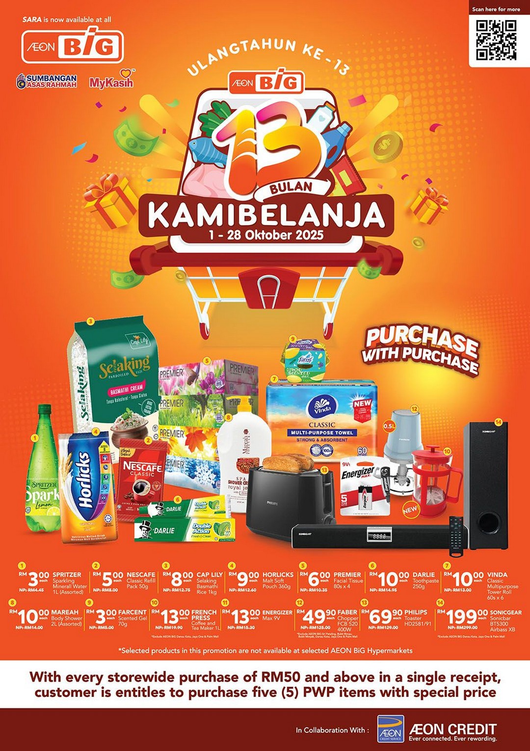 When it comes to finding great value for money, AEON BiG has always been a trusted name among Malaysians who love stretching every ringgit. This October, the popular hypermarket chain is pulling out all the stops to celebrate their 13th Anniversary with an incredible nationwide campaign — the KamiBelanja Deals & Purchase With Purchase (PWP) Promotion. Running from 1–28 October 2025, this anniversary sale is a massive celebration of savings, packed with discounts on groceries, household goods, electrical appliances, and more.