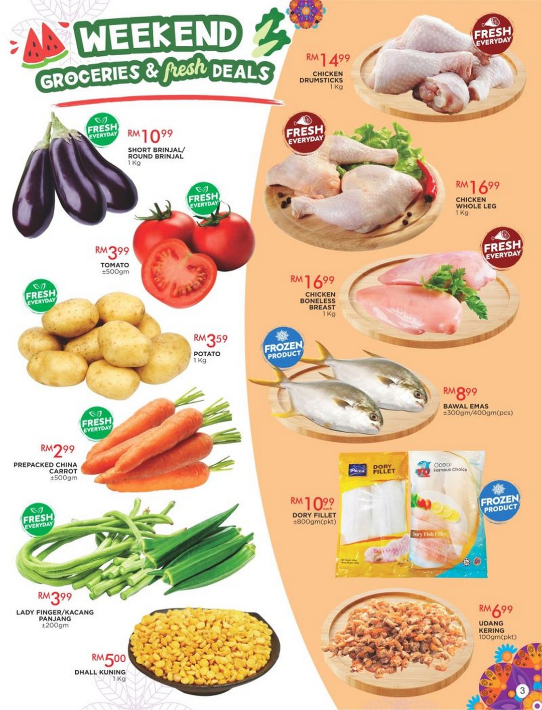 Fresh Chicken & Seafood: choose from drumsticks, whole legs, boneless breasts, bawal emas, and dory fillets.