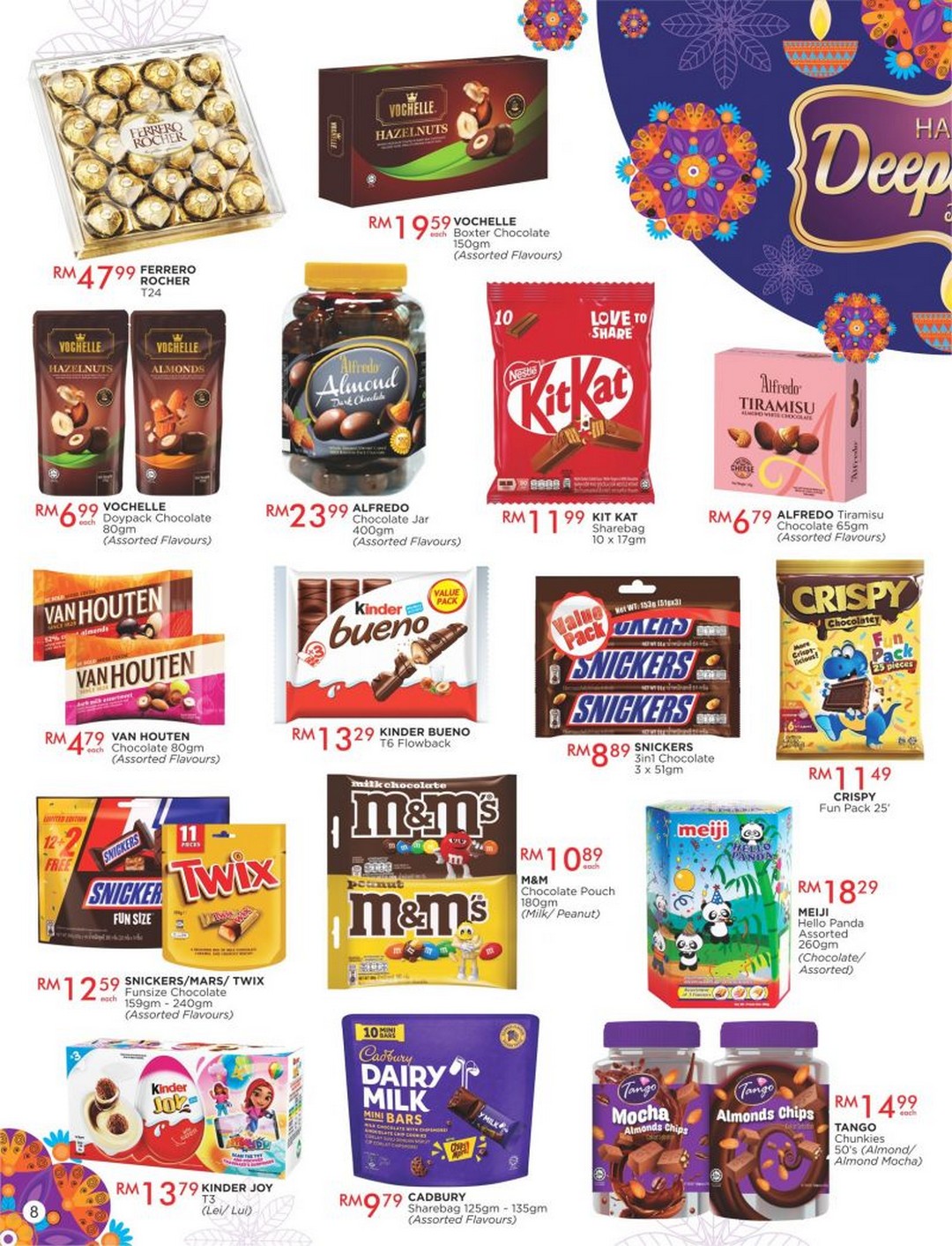 Chocolates & Sweets: Ferrero Rocher, Vochelle, Kit Kat, M&M’s, Kinder, Cadbury, Tango, and Meiji Panda.