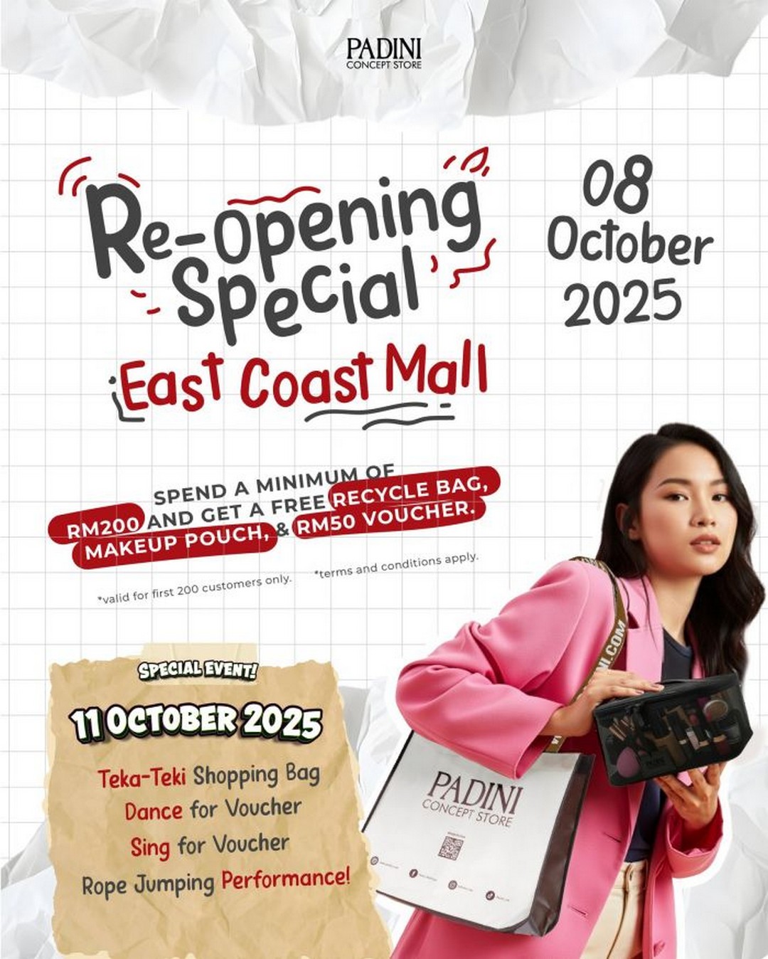 In summary, the Padini Concept Store reopening at East Coast Mall from 8–11 October 2025 is more than just a sales promotion. It’s a carefully curated event designed to reward shoppers, create memorable experiences, and celebrate the brand’s return. With limited-time freebies, a RM50 voucher, and a series of lively activities on 11 October, this event promises to be both rewarding and entertaining. Shoppers should prepare to arrive early, bring their friends or family, and enjoy everything this special reopening has to offer.