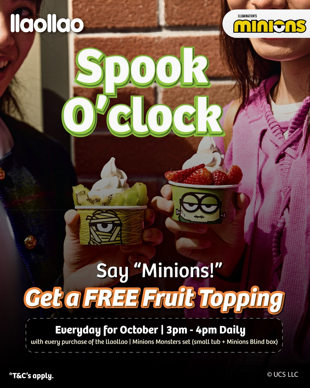 Here’s the deal: every day during October, if you visit a llaollao store between 3:00 PM and 4:00 PM, simply say the word “Minions!” at the counter, and you’ll receive a free fruit topping on your llaollao frozen yoghurt. That’s right—whether you prefer fresh strawberries, juicy mango, pineapple chunks, or ripe banana slices, llaollao will happily add that extra touch to your dessert at no additional cost.