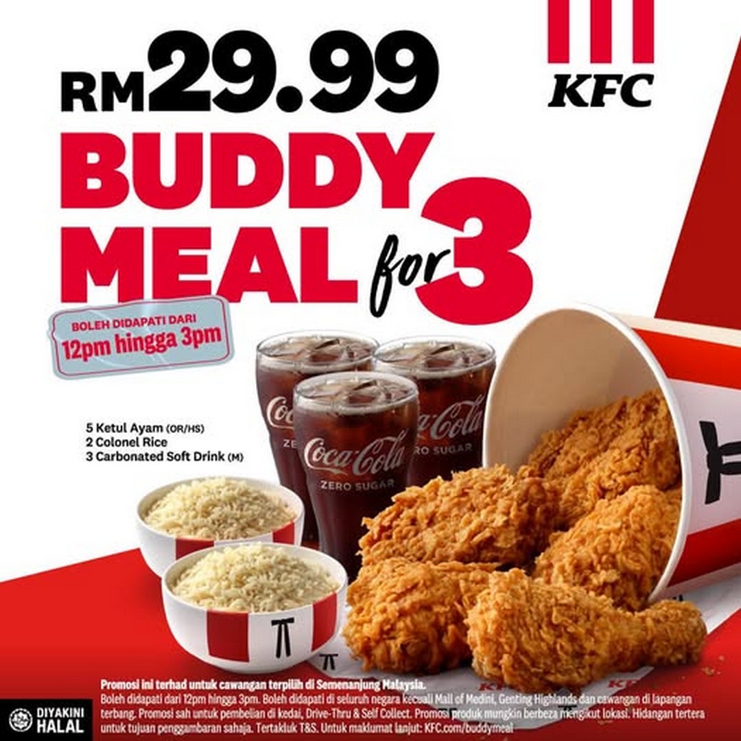 The Buddy Meal package features 5 pieces of KFC’s iconic fried chicken, 2 servings of Colonel Rice, and 3 refreshing drinks – all for only RM29.99. If you’ve been craving that golden, crispy chicken paired with flavourful rice and a drink to wash it all down, now is the ideal time to treat yourself and those around you.