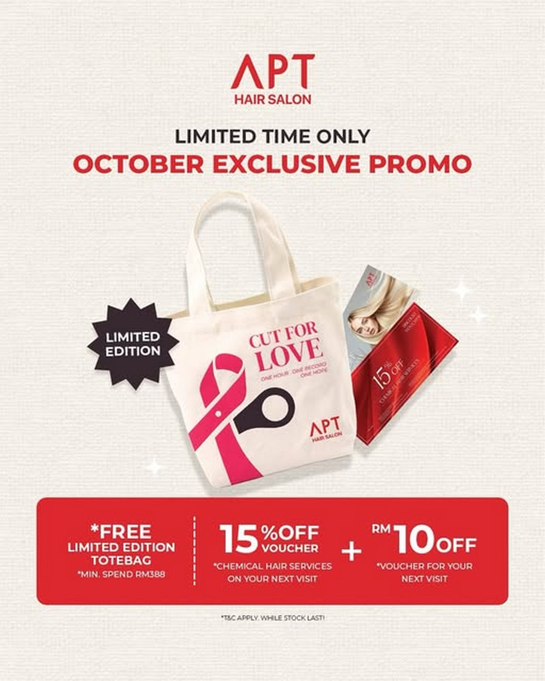To take part in this exclusive promotion, clients simply need to spend RM388 and above in a single receipt at any of the Klang Valley branches of APT Hair Salon. Once they do, they will receive the limited edition tote bag, while stocks last. The sense of urgency makes it an even more enticing offer, encouraging customers to plan their hair appointments and indulge in a full pampering session.