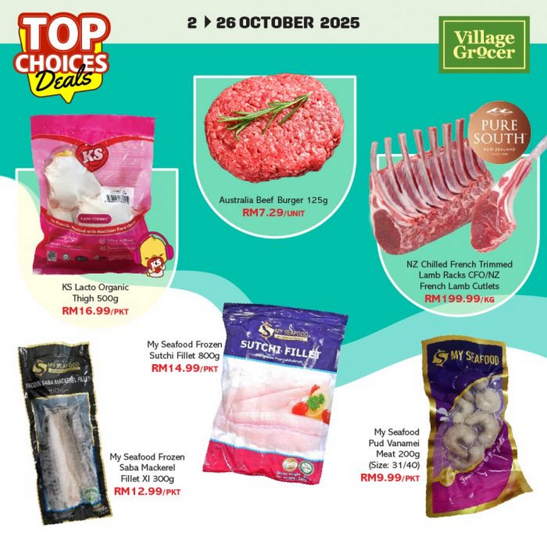 Village Grocer doesn’t stop at fresh produce; their Top Choices Deals extend to premium meats and seafood, making it a one-stop destination for a complete shopping experience. For poultry, KS Lacto Organic Thighs (500g) are offered at RM16.99 per packet, while Australia Beef Burgers (125g) are priced at RM7.29 per unit — convenient for busy families looking for quick, delicious meals.