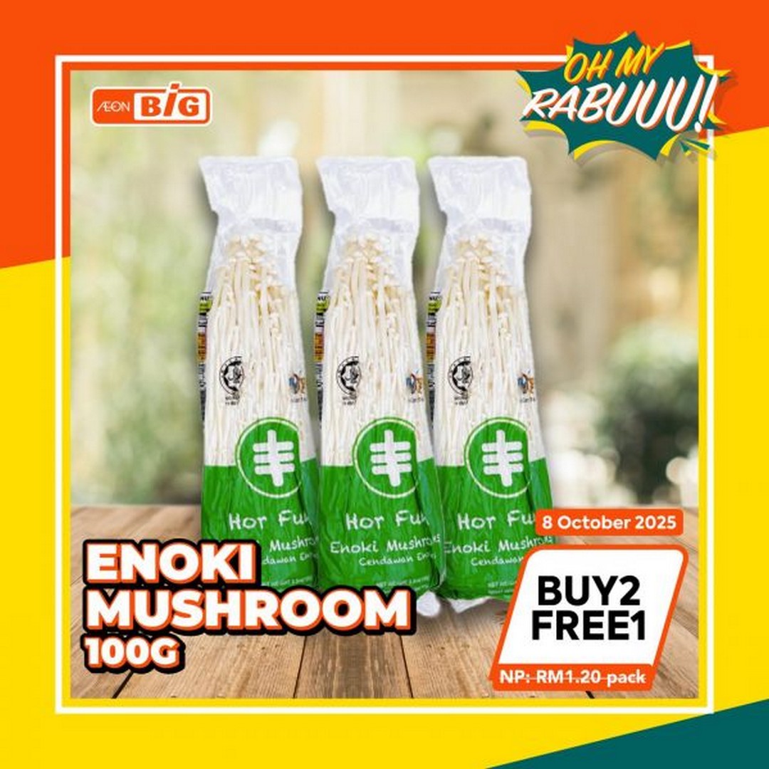 Mushrooms are a versatile ingredient for stir-fries, soups, and stews, and AEON BiG makes it even more enticing with a Buy 2 Free 1 offer on Enoki Mushroom 100g packs (originally RM1.20 each). This deal ensures shoppers get extra value while preparing their favourite dishes.
