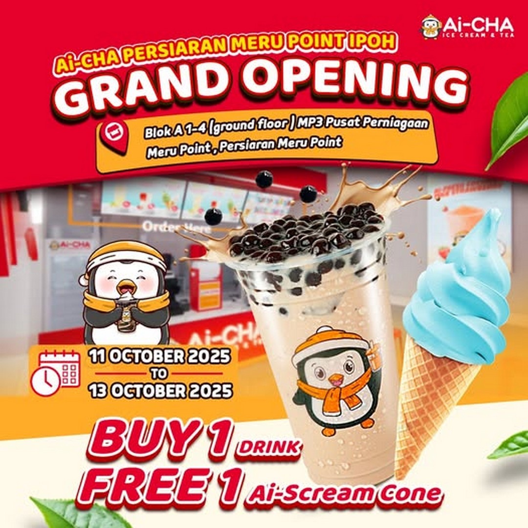 Tea lovers and dessert enthusiasts in Ipoh, take note! Ai-CHA Malaysia, the popular tea and dessert café brand, is officially opening its doors at Persiaran Meru Point, and they’re rolling out a special treat for everyone who drops by. From 11th to 13th October 2025, patrons can enjoy a complimentary ice cream cone with any drink purchase. Yes, you read that right — a refreshing ice cream cone to pair with your favourite bubble tea or beverage, absolutely free.