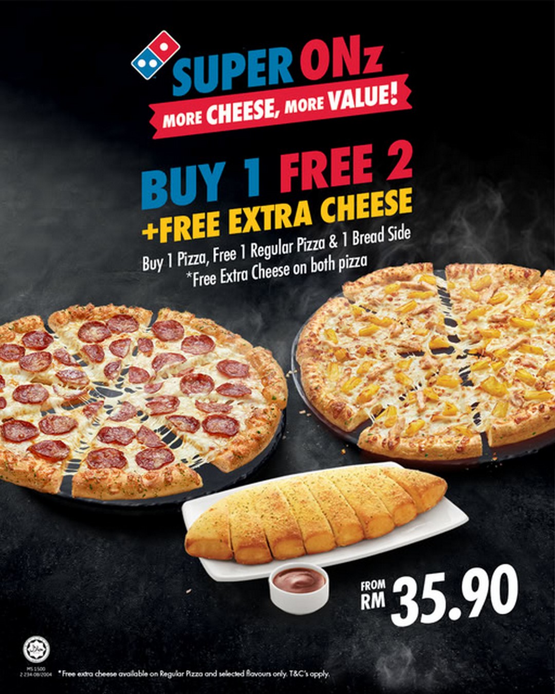 This Super Onz deal applies to selected flavours, so customers can choose from Domino’s best-selling pizzas. The free extra cheese applies to Regular Pizza and selected flavours only, according to the terms and conditions.