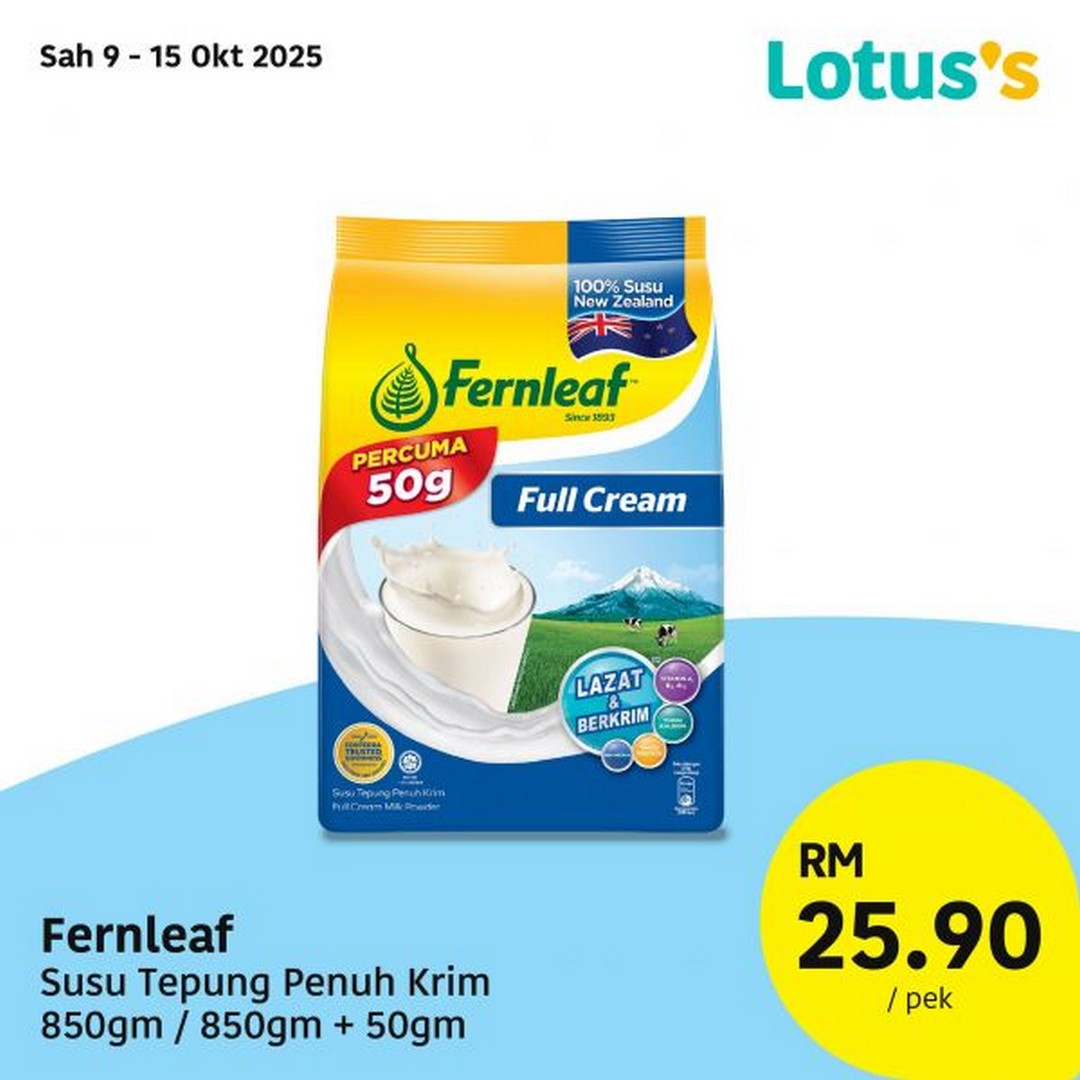 Need something hearty to sip on? Try Lotus’s Minuman Malt Coklat Berkhasiat (1kg) for just RM12.99 per pack — perfect for breakfast or as a comforting drink in the evening. Families can also enjoy savings on Fernleaf Susu Tepung Penuh Krim (850g + 50g) at RM25.90 per pack, a trusted brand that has long been part of Malaysian households.