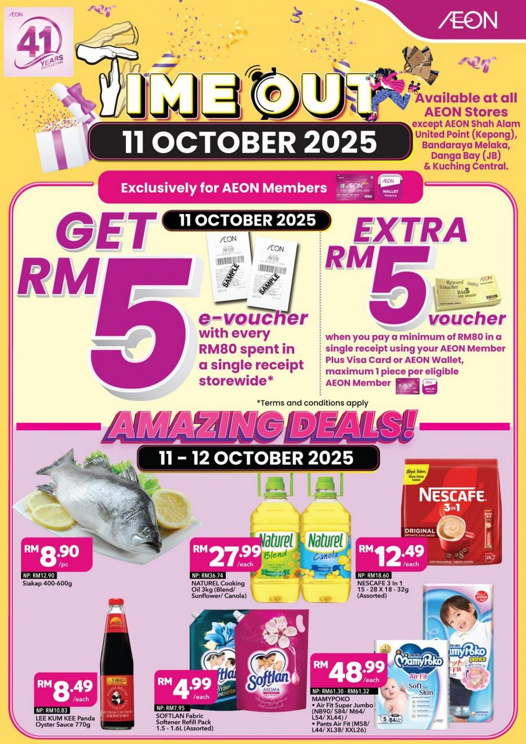 The AEON Time Out Day Promotion runs from 10–12 October 2025 at AEON stores nationwide, excluding AEON Shah Alam, United Point (Kepong), Bandaraya Melaka, Danga Bay (Johor Bahru), and Kuching Central. With over 30 AEON locations nationwide, shoppers can easily find a participating branch near them.