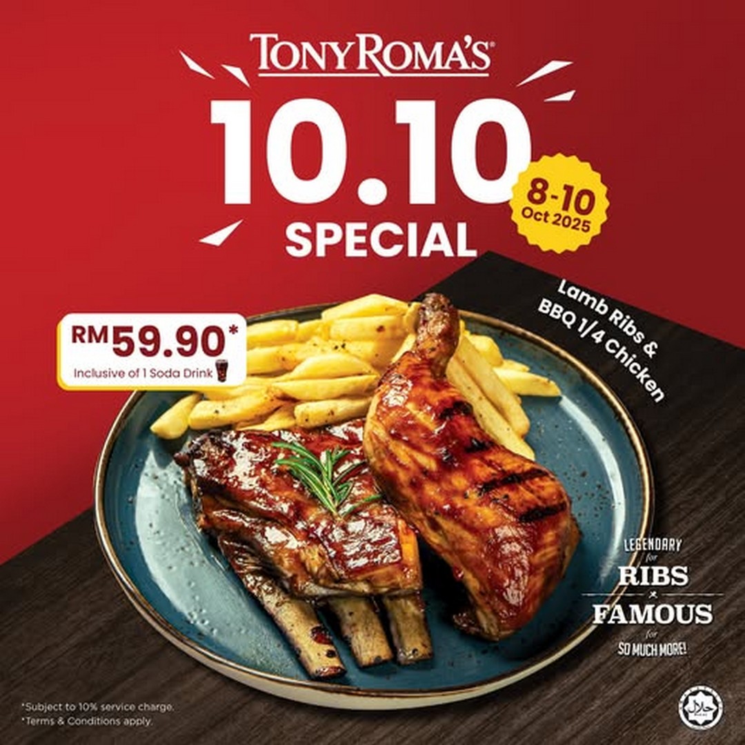 In summary, Tony Roma’s 10.10 promotion from 8 to 10 October 2025 is more than just a limited-time offer—it’s a celebration of flavour, quality, and value. With Lamb Ribs & BBQ ¼ Chicken or Beef Ribs & BBQ ¼ Chicken available for RM59.90, including a soda, diners are guaranteed a meal that’s both satisfying and memorable. With generous portions, legendary flavours, and a welcoming dining atmosphere, there are plenty of reasons to plan a visit, whether for a casual treat, a family dinner, or a weekend outing with friends.