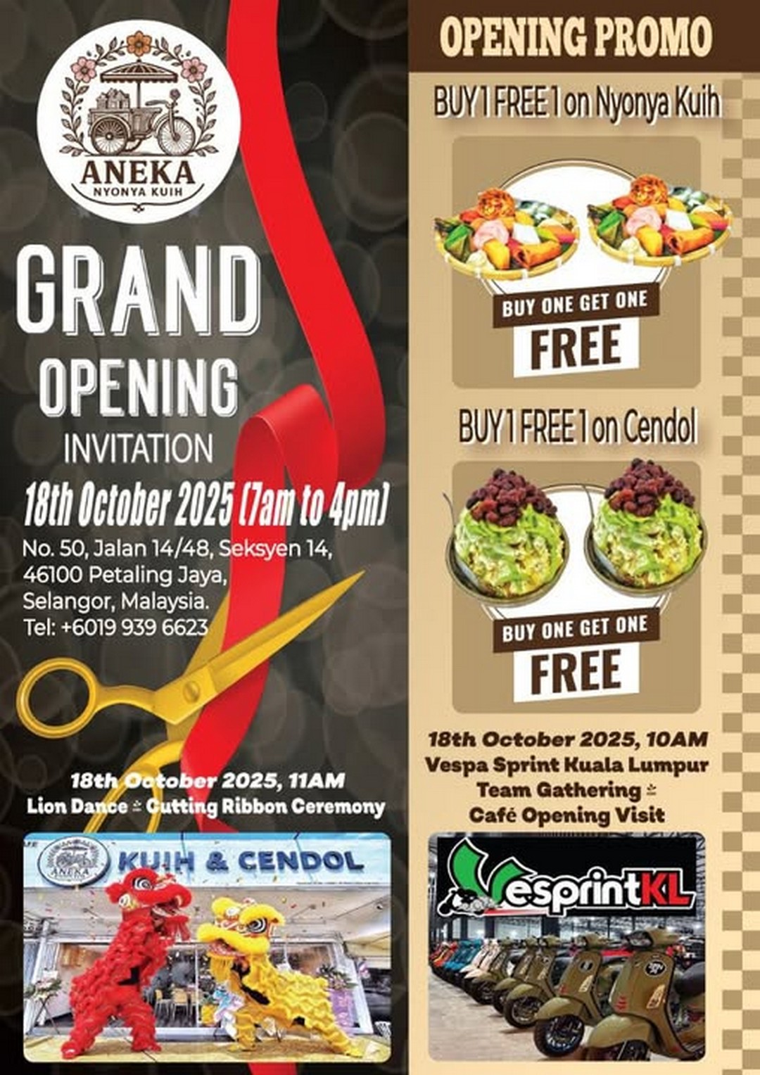 Whether you’re a devoted fan of Malaysian desserts or someone looking to explore new culinary experiences, the Aneka Nyonya Kuih grand opening offers plenty of reasons to mark your calendar. Arriving early ensures you don’t miss out on the exclusive promotions and allows you to fully enjoy the day’s activities, from the Vespa display to the Lion Dance performance. And with the Buy 1 Free 1 deals on Nyonya kuih and cendol, there is both value and indulgence for every visitor.