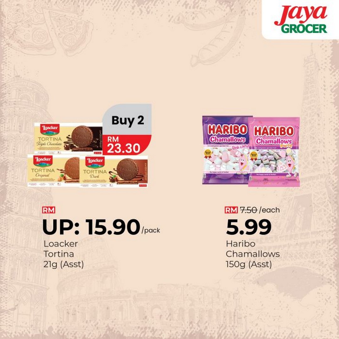 Among the must-grab items are Dr Oetker pizzas (295g–390g, assorted) now priced at RM17.99, down from the usual RM20.90. These pizzas bring the authentic Italian experience to Malaysian tables, perfect for a quick meal or weekend indulgence. For those who enjoy snacking, Haribo Chamallows (150g, assorted) are offered at RM5.99 instead of RM7.50, making it an ideal choice for kids or anyone with a sweet tooth.