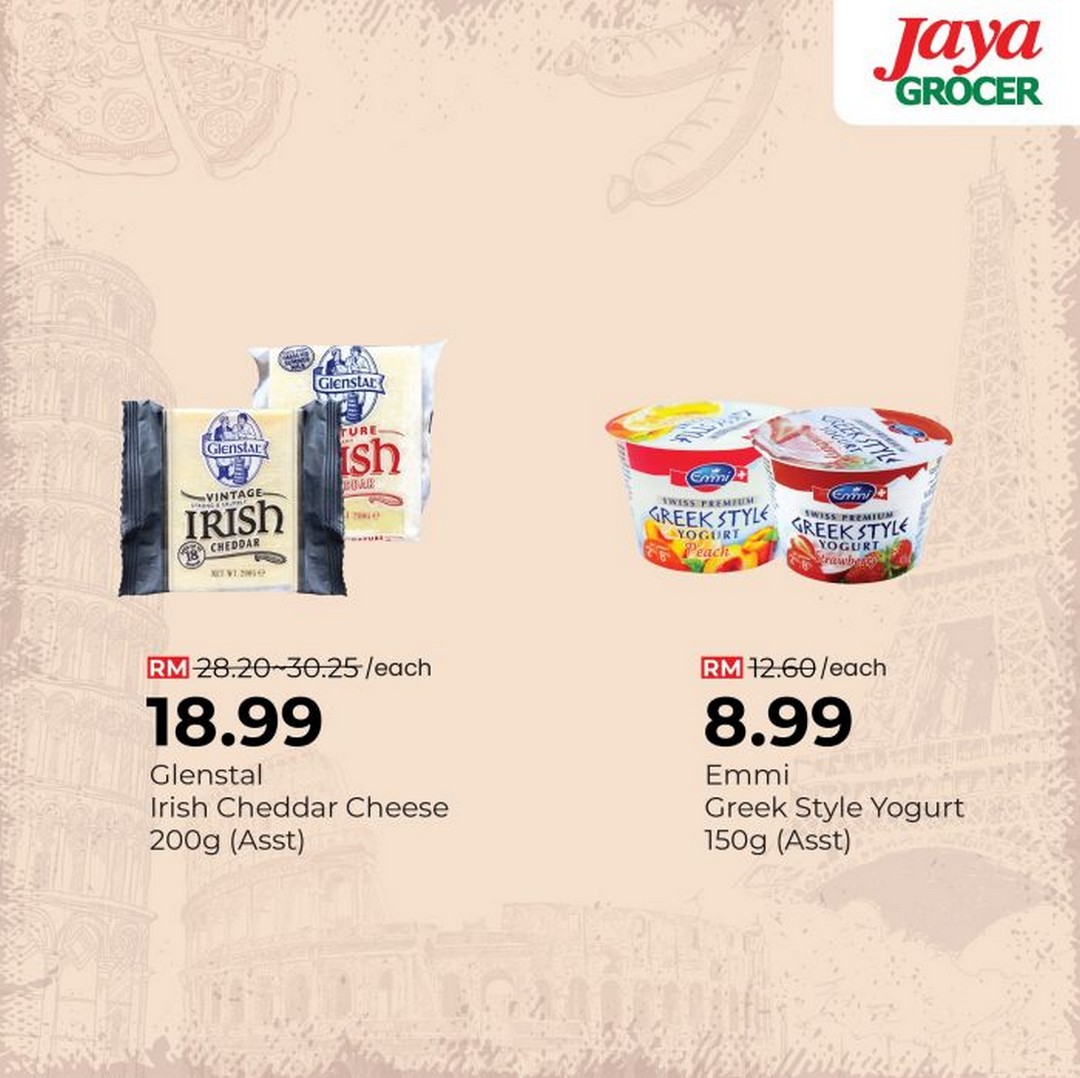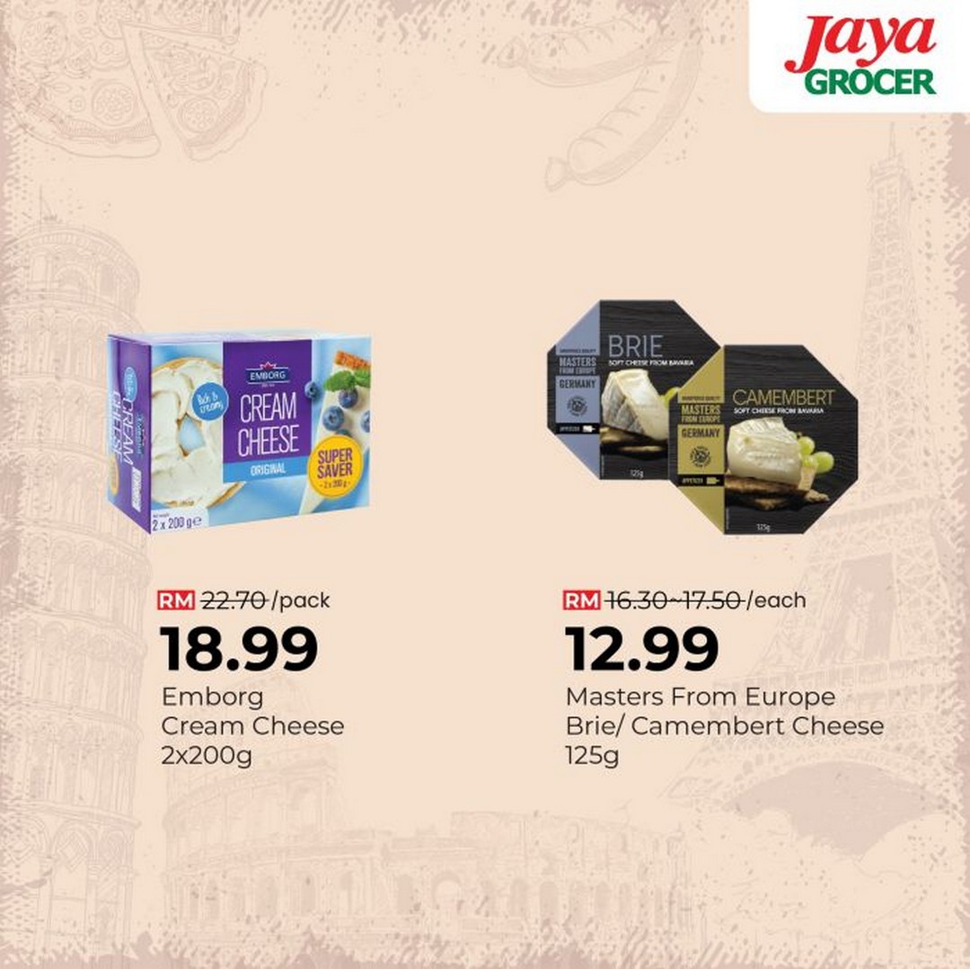 Cheese enthusiasts are also well-catered for with an extensive selection. Masters From Europe Brie and Camembert Cheese (125g) are reduced to RM12.99, offering a creamy, rich taste that pairs beautifully with wine or fresh bread. Glenstal Irish Cheddar Cheese (200g, assorted) is available for RM18.99, down from RM28.20–30.25, providing an excellent option for cheese platters or melting over baked dishes. Emborg Cream Cheese (2x200g) is on offer at RM18.99, making it easier to create creamy spreads or dessert recipes at home.