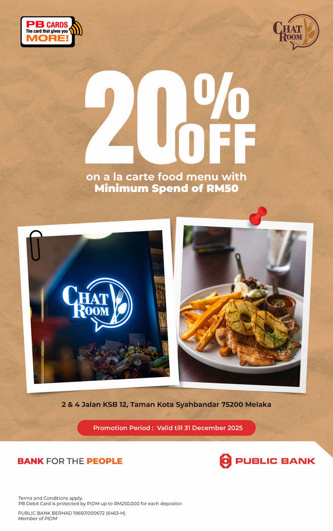 From now till 31 December 2025, Public Bank Credit and Debit Cardmembers can indulge in a 20% discount on Chatroom Melaka’s à la carte food menu with a minimum spend of RM50. It’s a generous deal that lets diners savour their favourite dishes while saving at the same time – an irresistible combination for anyone who loves both good food and good value.