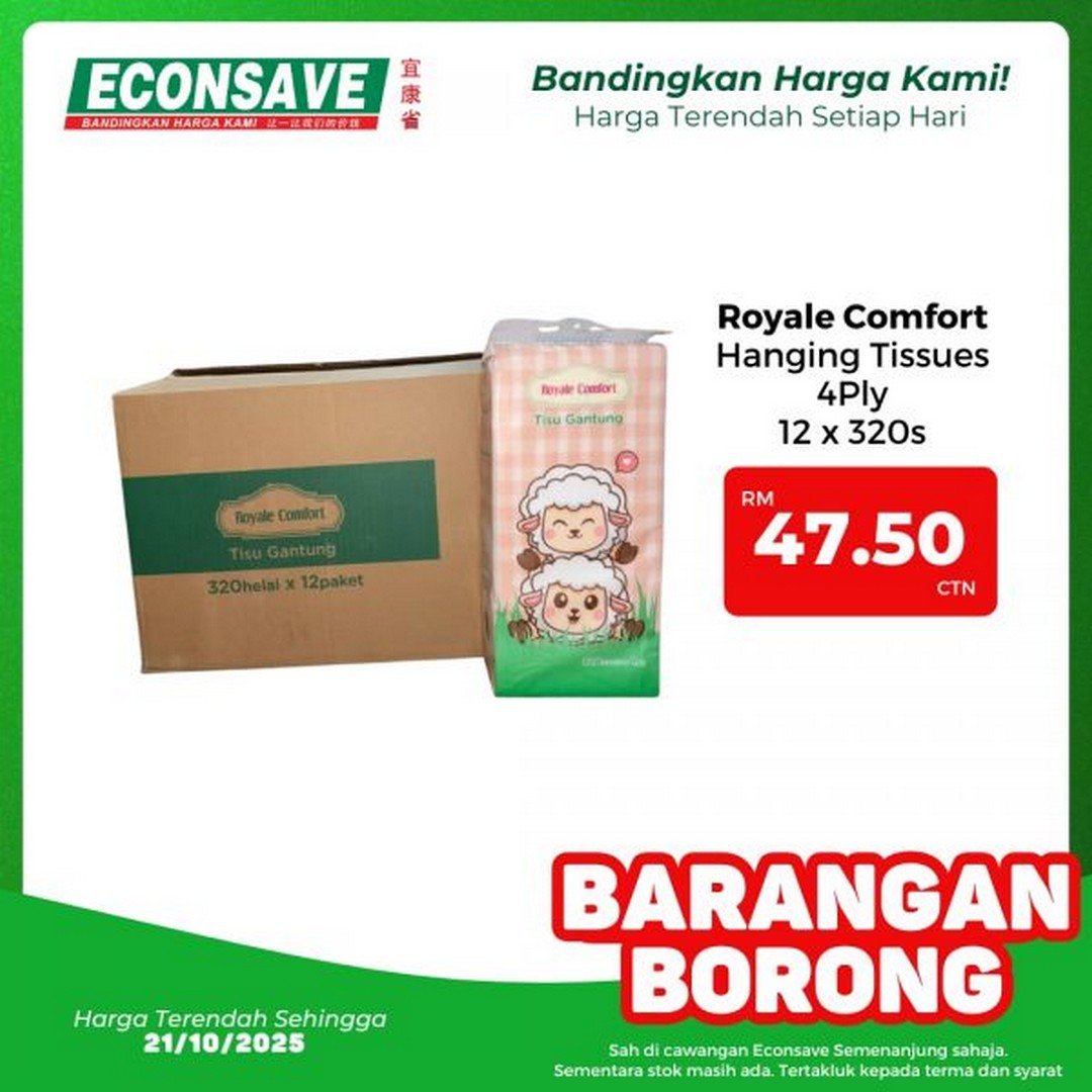 Royale Comfort Hanging Tissues 4Ply (12 x 320s) – RM47.50 per carton: Hygiene and comfort come together with these soft and durable tissues. Bulk purchase ensures you won’t run out during busy months.
