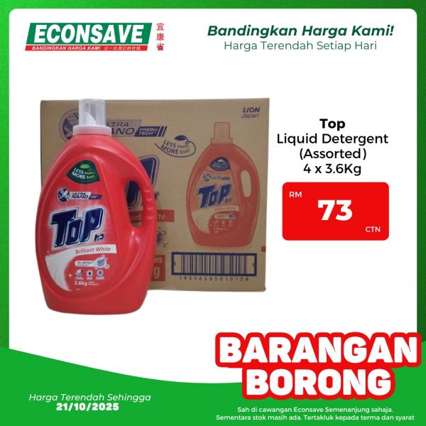 Top Liquid Detergent Assorted (4 x 3.6Kg) – RM73 per carton: Keep clothes clean and fresh with this reliable detergent, ideal for households or small laundry businesses.