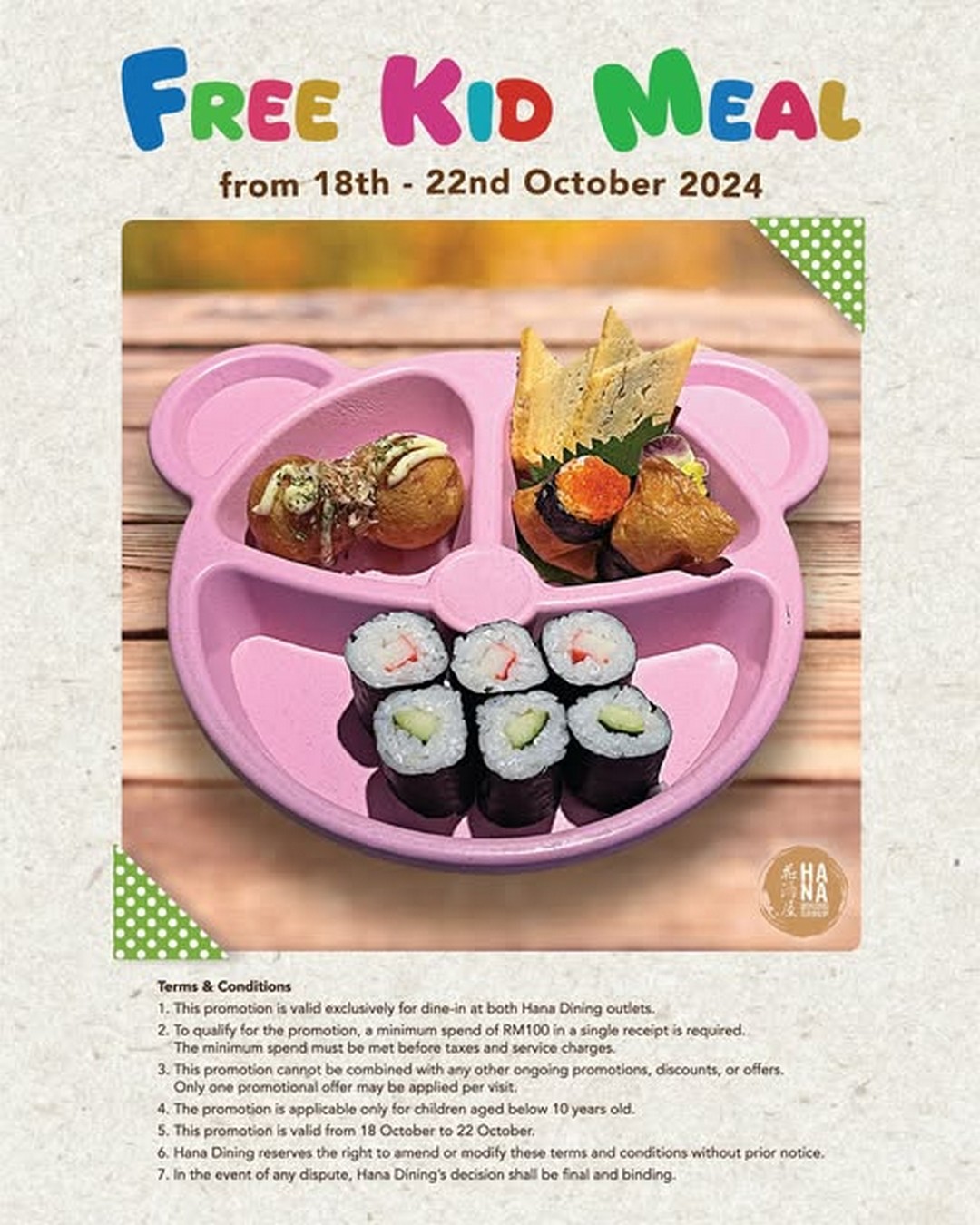 Moreover, this promotion demonstrates Hana Dining’s commitment to family-friendly dining. In a time when eating out can sometimes feel rushed or stressful, having a clear and generous offer like a free kid’s meal makes the experience more accessible and enjoyable for everyone. It is a thoughtful gesture that balances the needs of parents with the joy of children, making a trip to Hana Dining an appealing option for families planning their meals in October.