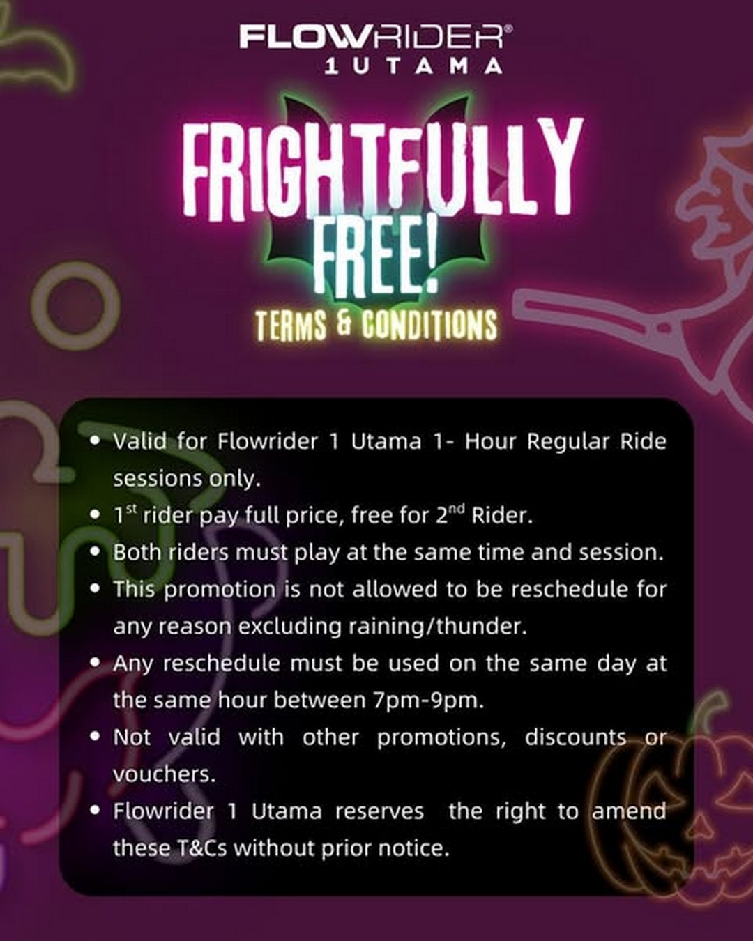 In conclusion, Halloween at FlowRider 1 Utama is shaping up to be an event you don’t want to miss. The Buy 1 Free 1 deal ensures that more people can join in the fun, the timing is convenient for evening activities, and the atmosphere combines sport and seasonal festivities. Whether you are a first-timer or a seasoned surfer, this promotion makes it the perfect moment to embrace a little adventure.