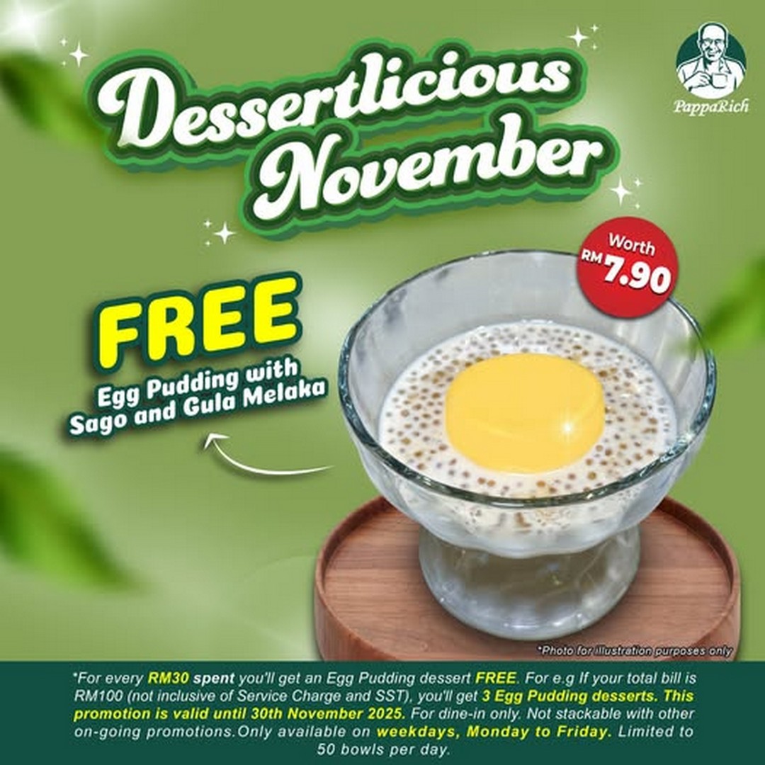 For dessert lovers in Malaysia, November just got a lot sweeter thanks to PappaRich! Known for their authentic Malaysian cuisine and delightful dessert menu, PappaRich is offering a special treat for customers with their Dessertlicious November promotion. From 31 October 2025 onwards, diners have the chance to enjoy a free Egg Pudding with Sago and Gula Melaka, valued at RM7.90.