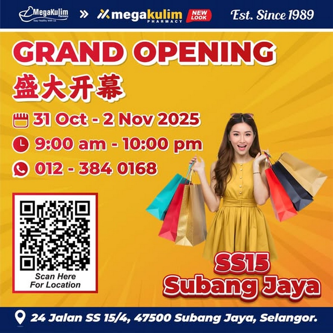 If there’s one thing Malaysians love, it’s a good celebration that comes with fantastic deals—and Mega Kulim Pharmacy is bringing exactly that to SS15, Subang Jaya this October. Their much-awaited Grand Opening Promotion Event is set to be an exciting three-day affair from 31 October to 2 November 2025, filled with exclusive giveaways, complimentary health screenings, and irresistible discounts that are hard to ignore. For anyone who values both health and savings, this is an event worth marking in the calendar.