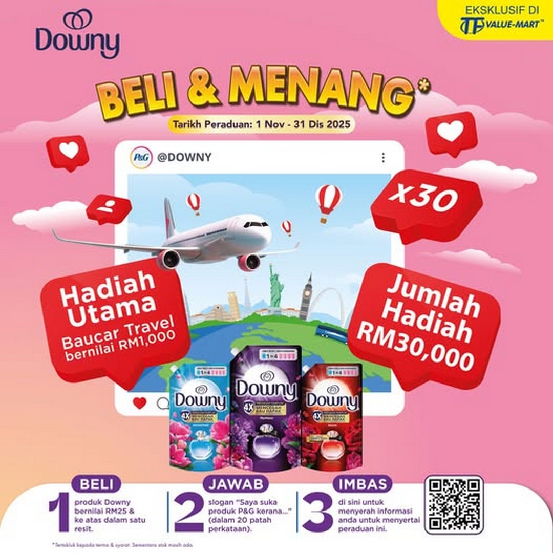 Purchase Downy products worth RM25 or more in a single receipt from any TF Value-Mart branch between 1 November and 31 December 2025.