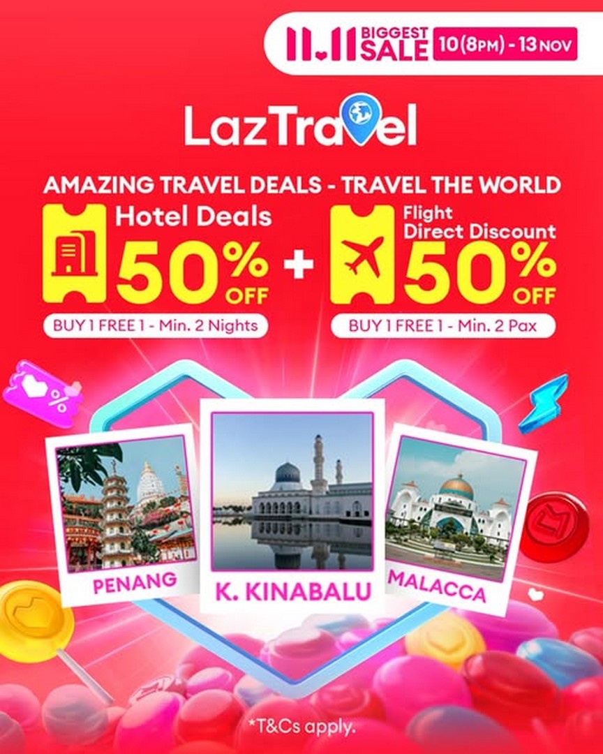 From 10 to 13 November 2025, Lazada Malaysia invites everyone to “Travel the World with LazTravel,” offering exclusive discounts that will make travelling easier on the wallet. Think 50% OFF hotel bookings and even a Buy 1 Free 1 deal on flights – it’s practically the perfect excuse to pack your bags and take off.