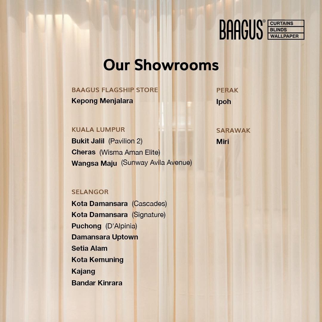 Moreover, Baagus Curtains has made their showrooms accessible across Malaysia, making it easier for customers from different regions to participate in the promotion. Locations include flagship and regional stores such as Kepong, Kota Damansara (Cascades), Bukit Puchong (D’Alpinia), Bukit Jalil (Pavilion 2), Setia Alam, Cheras (Wisma Aman Elite), Kajang (Vista Valley), Kota Kemuning, Damansara Uptown, Wangsa Maju (Sunway Avila Avenue), Bandar Rimbayu (Uptown Rimbayu), Bandar Kinrara, Elmina Shah Alam, Miri, and Ipoh. This wide coverage ensures that most customers are within a reasonable distance from a showroom.