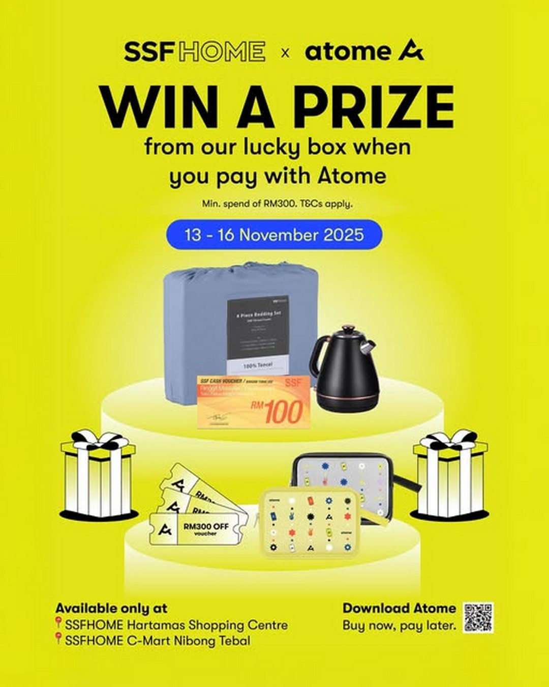 In summary, the SSFHOME Lucky Box promotion is the perfect combination of practical home shopping, flexible payment with Atome, and the thrill of winning exclusive prizes. From luxurious bedding and kitchen essentials to instant vouchers and other Atome rewards, there’s something for everyone. The limited timeframe – 13 to 16 November 2025 – means shoppers need to act quickly to take full advantage of the offer. Whether visiting the Hartamas Shopping Centre or C-Mart Nibong Tebal outlets, or browsing online in preparation, this promotion promises a rewarding shopping experience for all home enthusiasts.