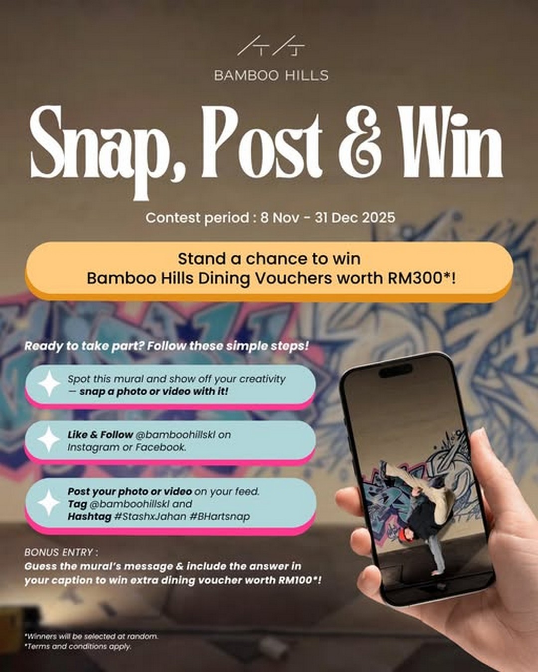 Don’t forget, the contest runs till 31 December 2025 at 11.59pm, so make sure to visit Bamboo Hills before the year ends. Bring your friends or family along, enjoy the space, and capture your best moment in front of the @mr_stash x @jahan_ mural. Who knows — your photo might just be the winning one!