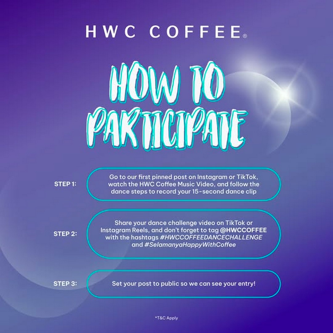 Post your dance video on TikTok or Instagram Reels. Remember to tag @hwc_malaysia and include the hashtags #HWCCOFFEEDANCECHALLENGE and #SelamanyaHappyWithCoffee in your caption.