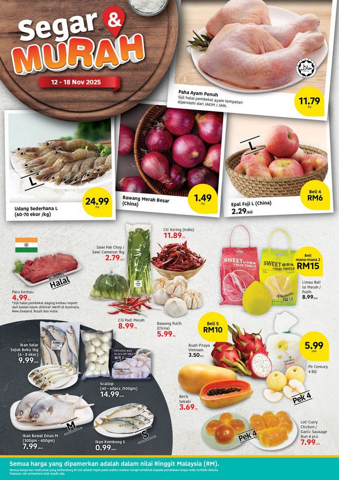 The fresh produce section is equally impressive. Paha Ayam Penuh is priced at RM11.79 per kilogram, while Udang Sederhana L is available at RM24.99 per kilogram. For fruit enthusiasts, Epal Fuji L (China) is offered at RM2.29 each, and Bawang Merah Besar (China) can be purchased at just RM1.49 per kilogram. These deals are perfect for preparing wholesome meals at home while keeping grocery expenses under control.