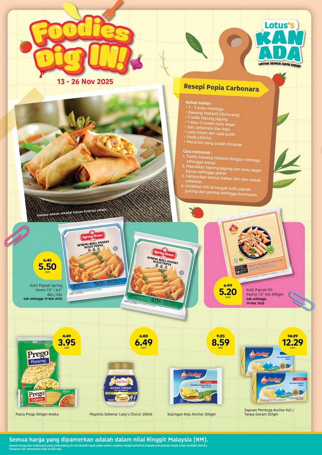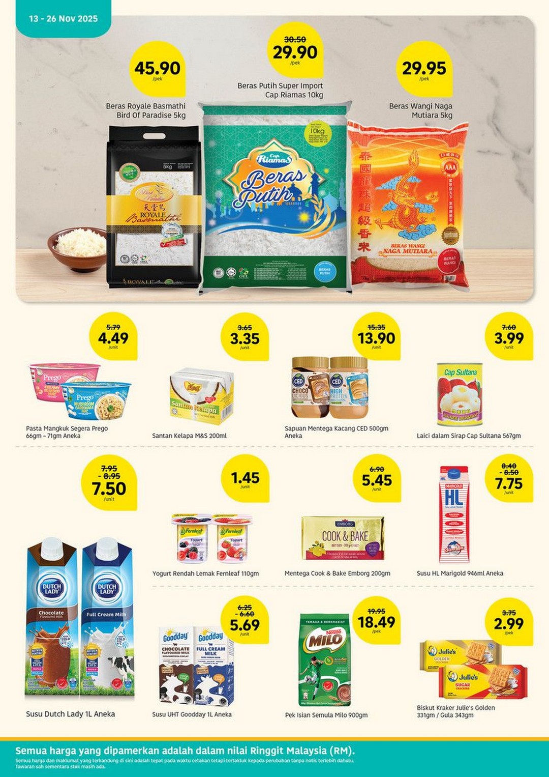For those who enjoy ready-to-eat meals or unique flavours, the catalogue features Lotus’s brand and Thailand-themed items. Mi Segera Tomyum Kung Asli / Creamy Lotus’s 10 x 55gm is priced at RM9.99 per pack, providing a quick and tasty option for lunch or dinner.