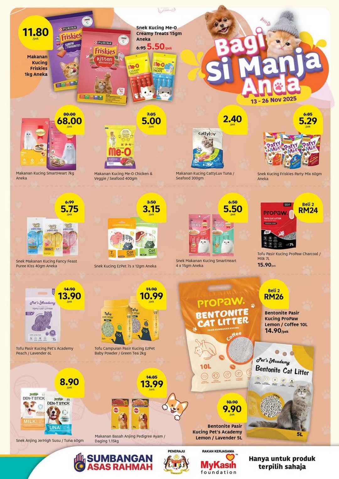 Pet owners will also appreciate the deals on pet food and accessories. Keeping cats happy and healthy doesn’t have to break the bank with Makanan Kucing Friskies 1kg Aneka priced at RM11.80 per pack. For treats, Snek Kucing Me-O Creamy Treats 15gm Aneka is available at RM5.50 per pack, and for maintaining hygiene, Bentonit Pasir Kucing ProPaw Lemon / Coffee 10L is priced at RM14.90 per pack.