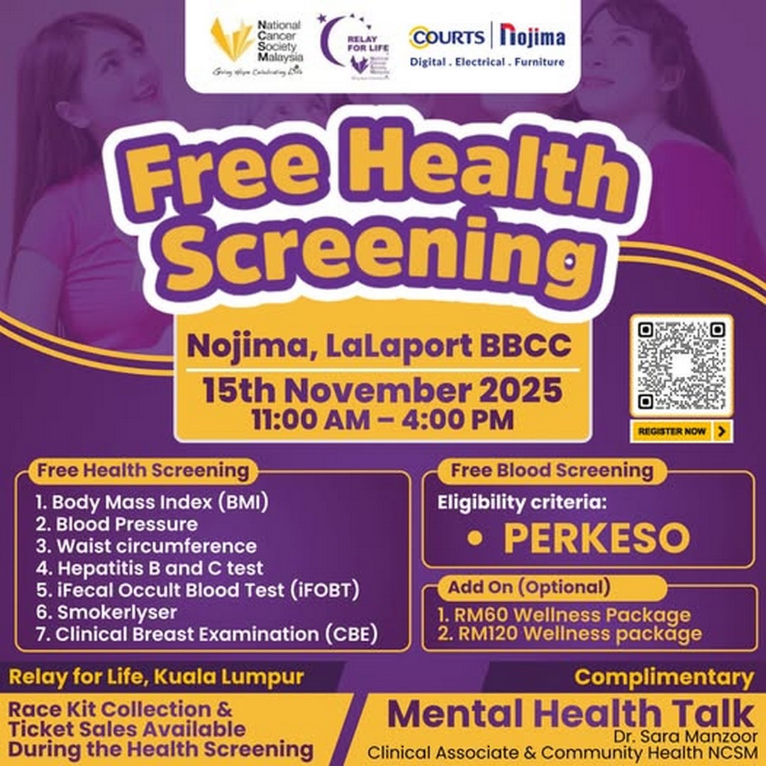 On 15 November 2025, Nojima is inviting the public to join a Free Health Screening session, in collaboration with the National Cancer Society Malaysia (NCSM). This event is designed to help individuals take proactive steps towards maintaining their well-being and understanding the importance of regular health check-ups. To make it even more enriching, the session will also feature a Mental Health Talk by Dr. Sara Manzoor, a respected name in the field of mental wellness.