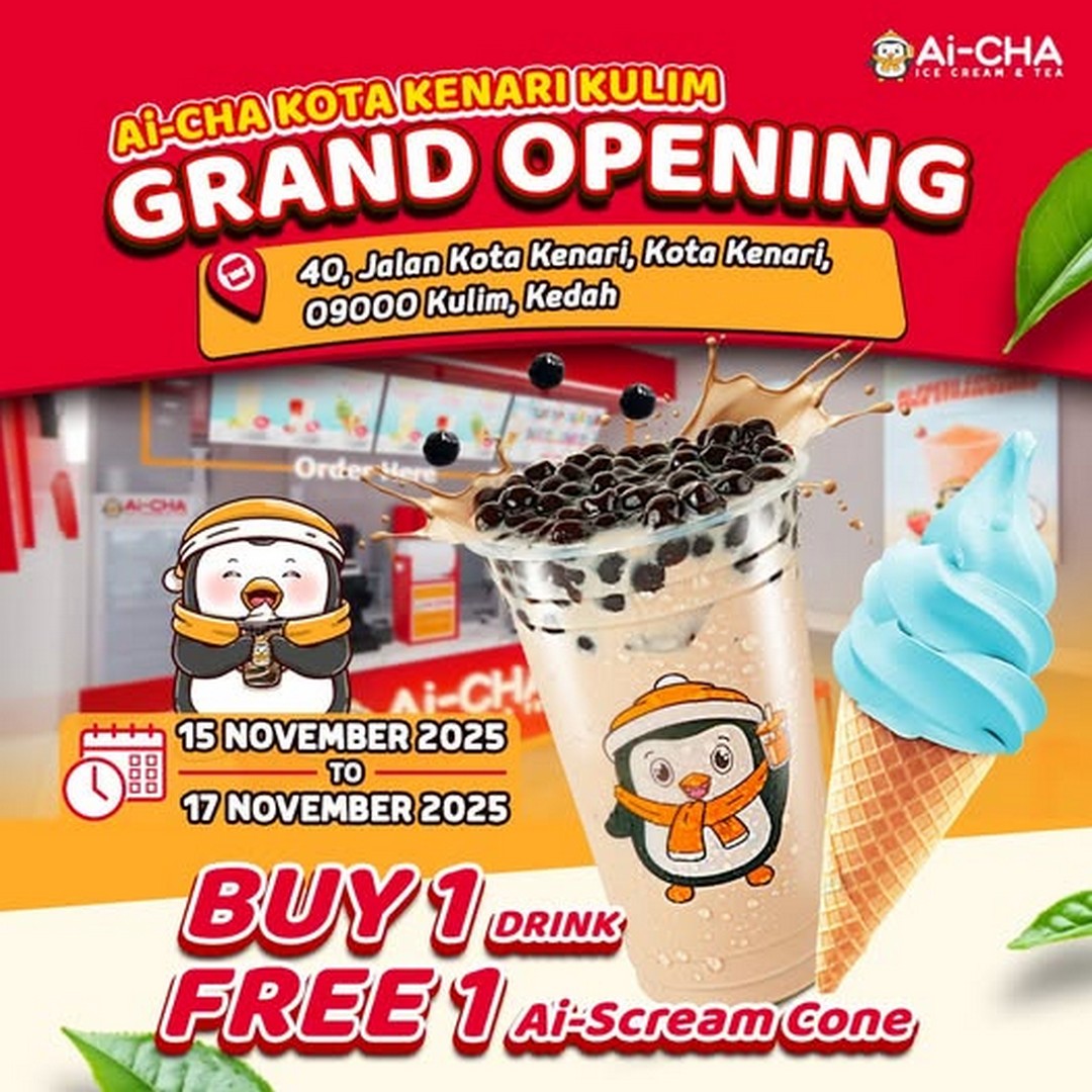 If you’re a fan of refreshing drinks and sweet treats, there’s a delightful reason to head over to Kulim this November. Ai-CHA Malaysia, the popular beverage brand known for its creative and refreshing drink selections, is celebrating the grand opening of its new outlet at Kota Kenari Kulim with an irresistible offer. From 15 to 17 November 2025, customers can enjoy a complimentary ice cream cone with any drink purchase — a simple yet sweet way to welcome everyone to their newest store.