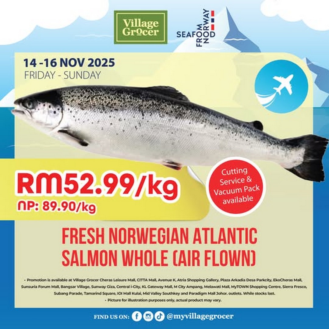 If there is one thing many shoppers in Malaysia appreciate, it is the rare moment when a premium ingredient drops to a genuinely attractive price. Fresh Norwegian Atlantic Salmon, imported and air-flown all the way from the cold waters of Norway, usually sits in the premium range of the seafood section. It is known for its reliability, its buttery texture, and its naturally rich flavour profile. Yet, for a limited period, Village Grocer is offering them something quite special: whole air-flown Norwegian Atlantic Salmon at only RM52.99 per kilogram from 14 to 16 November 2025. For seafood lovers, home cooks, or anyone who enjoys stocking up their freezer with quality ingredients, this is the sort of promotion that does not come around often.