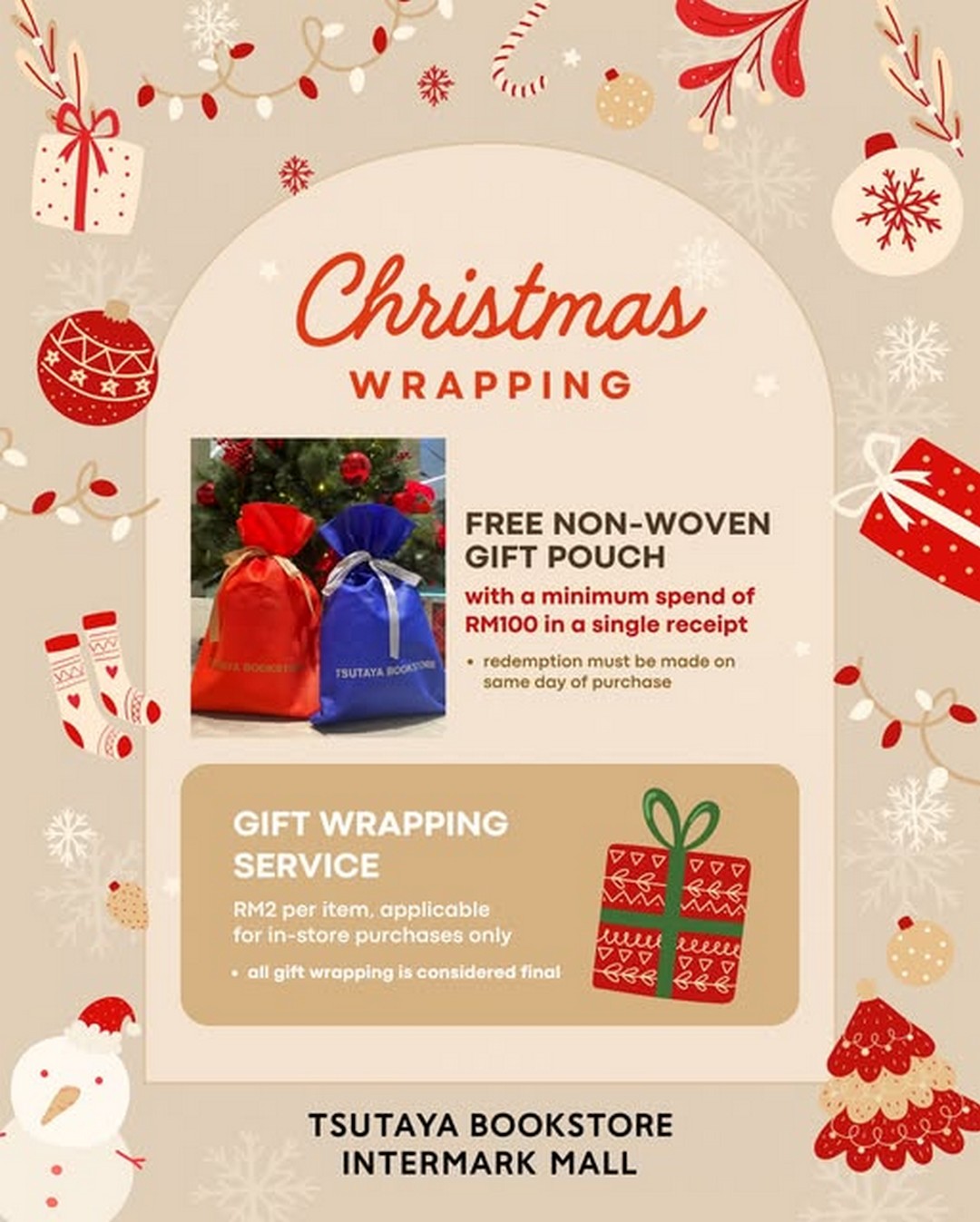 In summary, Tsutaya Bookstore’s holiday gift pouch giveaway is an easy and practical way to enhance your festive shopping. By spending RM100 in a single receipt, shoppers receive a free non-woven gift pouch, while those seeking a more polished presentation can opt for the RM2 per item gift wrapping service. With its convenient location at Intermark Mall, extended opening hours, and a cozy café to enjoy a break, Tsutaya makes holiday shopping not only easy but also enjoyable.