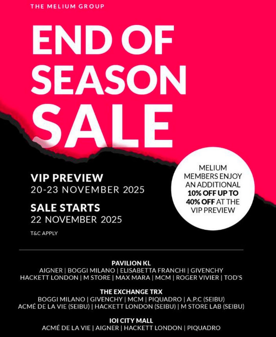 Before the sale officially opens to the public, The Melium Group is offering a VIP Preview from 20 to 23 November 2025. During this period, Melium members can enjoy an additional 10% off on top of discounts up to 40%. For those who appreciate early access and exclusive perks, this is the perfect opportunity to shop the latest collections from luxury brands such as Aigner, Givenchy, Hackett London, Max Mara, and more, before the crowds arrive.