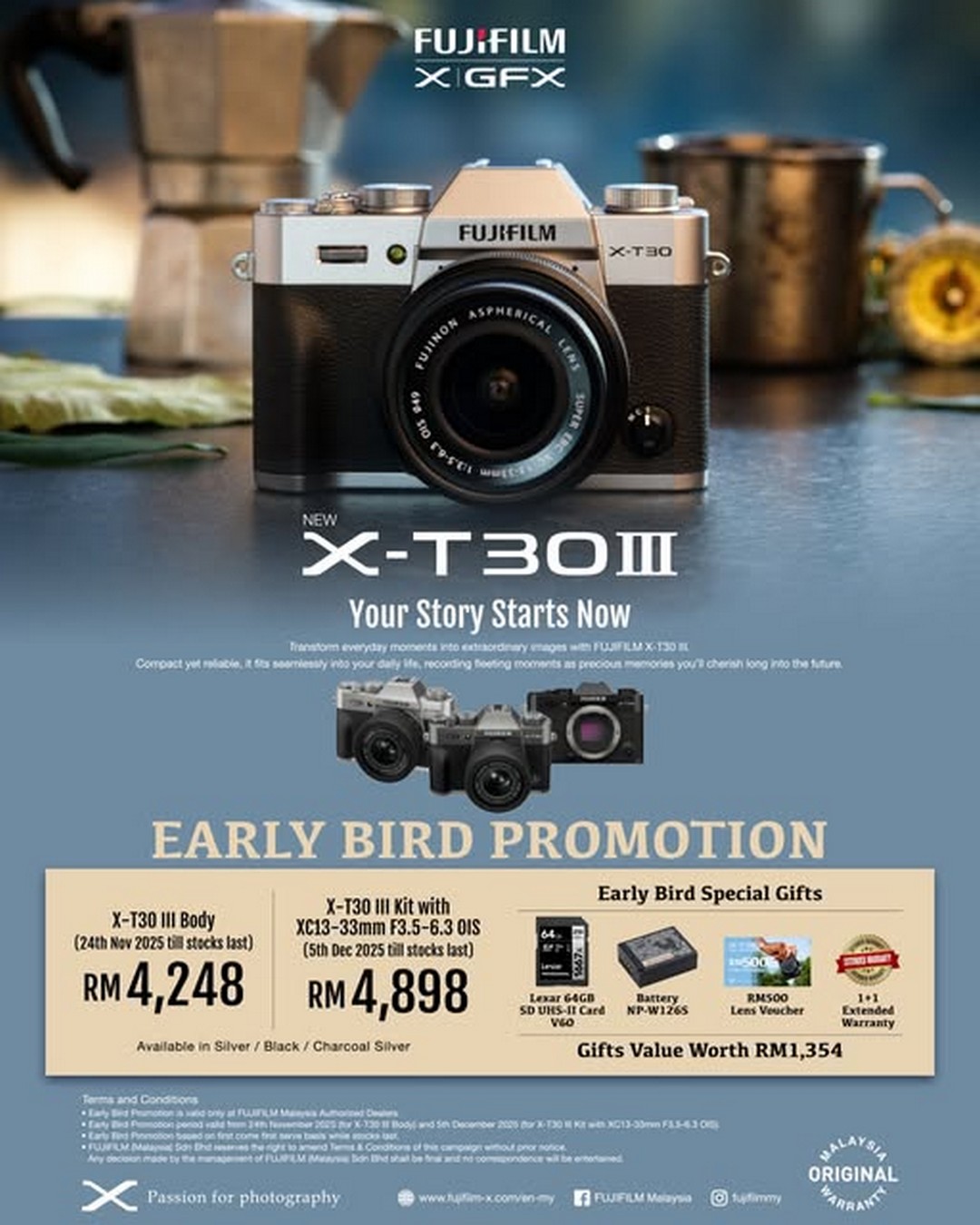 As with any Early Bird Promotion, timing is crucial. The X-T30 III body-only option is available from 24 November 2025, while the kit with lens is available from 5 December 2025, both strictly while stocks last. FUJIFILM’s limited promotional stock ensures that those who act quickly will be among the first to enjoy these added benefits and be the pioneers of their next creative chapter.