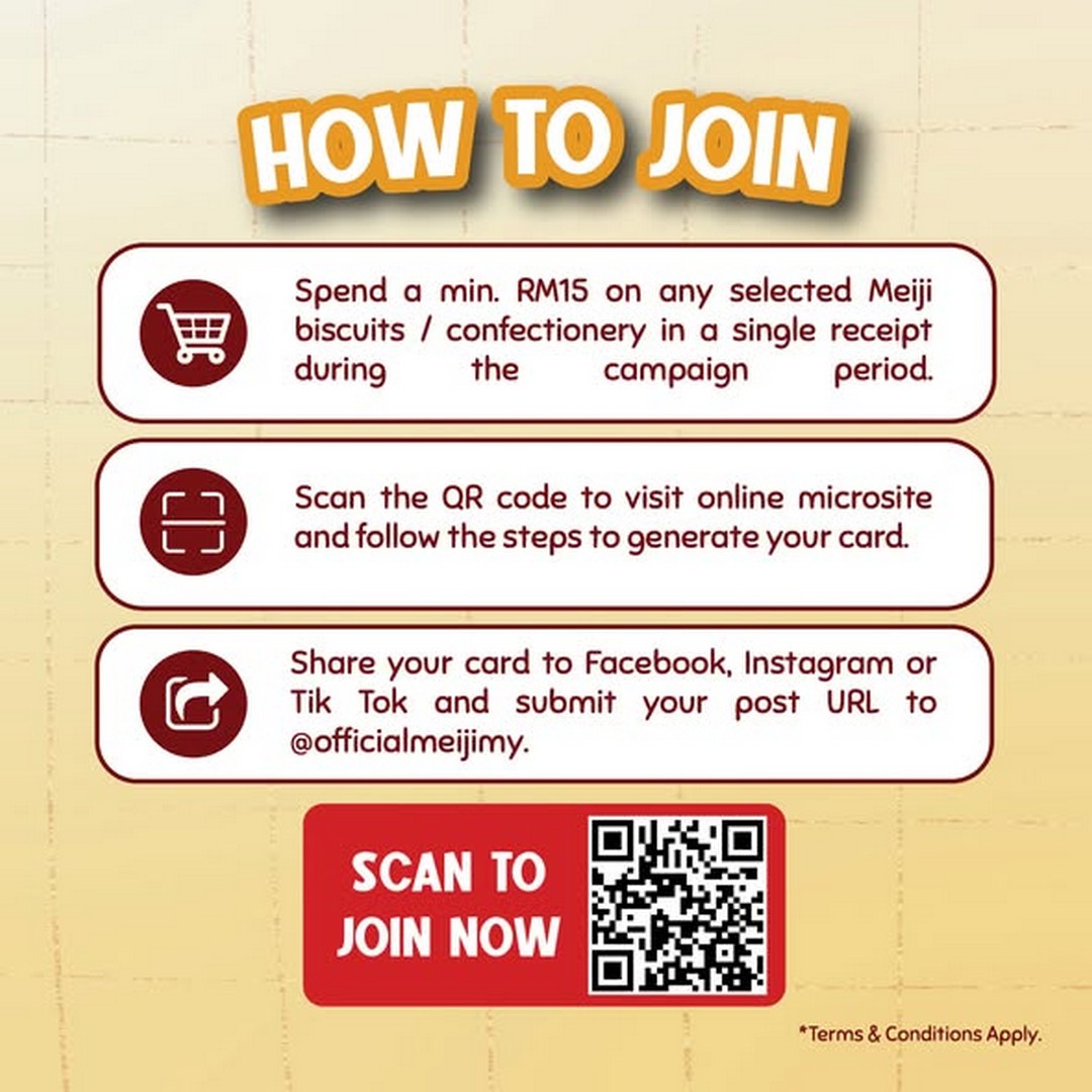 Venue: Purchase selected Meiji biscuits/confectionery at participating stores, then visit www.wrapup2025withmeiji.online to generate your Cherished Moments Card