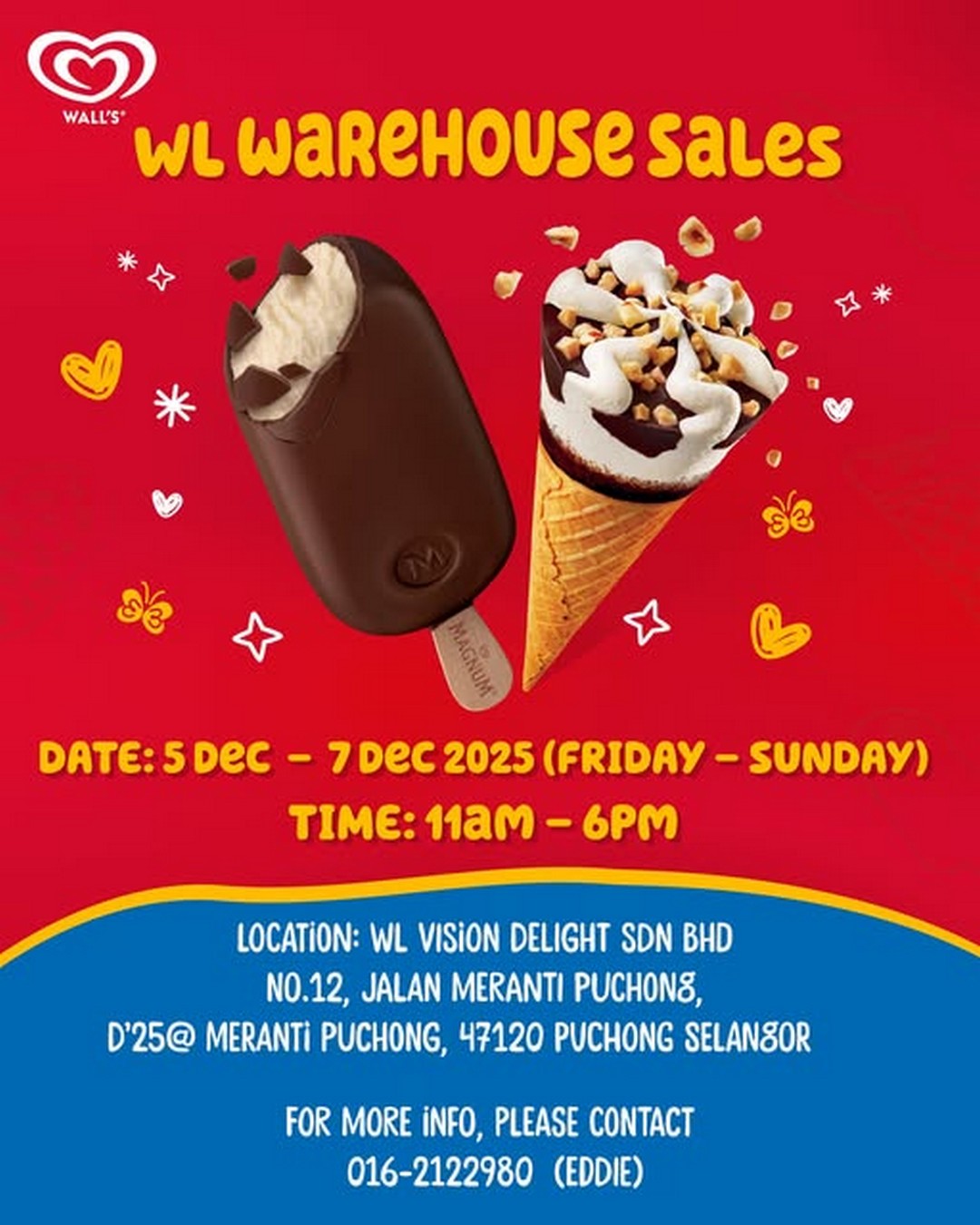 Taking place from 5 to 7 December 2025, the Wall’s Warehouse Sale at WL Vision Delight Sdn Bhd in Puchong will run from 11am to 6pm daily. The event’s popularity in previous years has shown just how much Malaysians enjoy deals that feel genuinely worthwhile. Warehouse sales offer something most regular promotions in supermarkets cannot: significantly reduced pricing, bulk options, and the chance to sample a wider variety of items than what one might typically see in stores. Wall’s themselves have been a household name for generations, so naturally, any opportunity to purchase their products at a discount tends to attract both families and individuals.