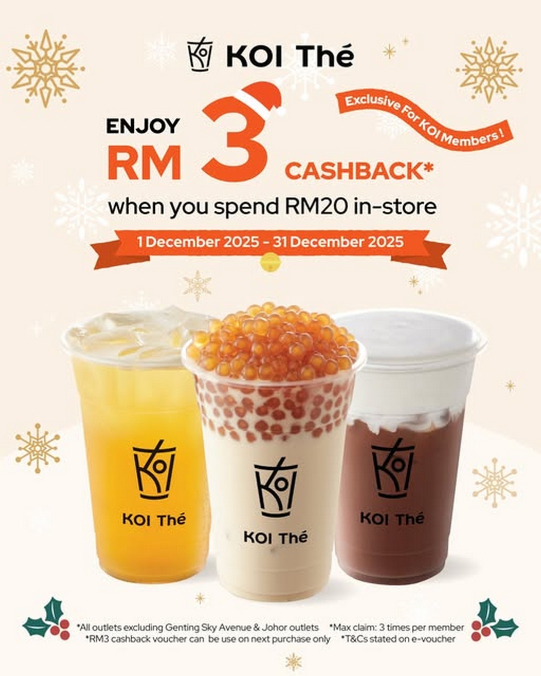 The promotion is valid across all KOI Thé outlets in Malaysia, with the exception of Genting Sky Avenue and their Johor branches. Members can claim this cashback voucher up to three times throughout December, giving them multiple opportunities to enjoy the savings. The RM3 cashback voucher is redeemable on your next purchase only, making it perfect for regular KOI enthusiasts who plan to revisit soon.
