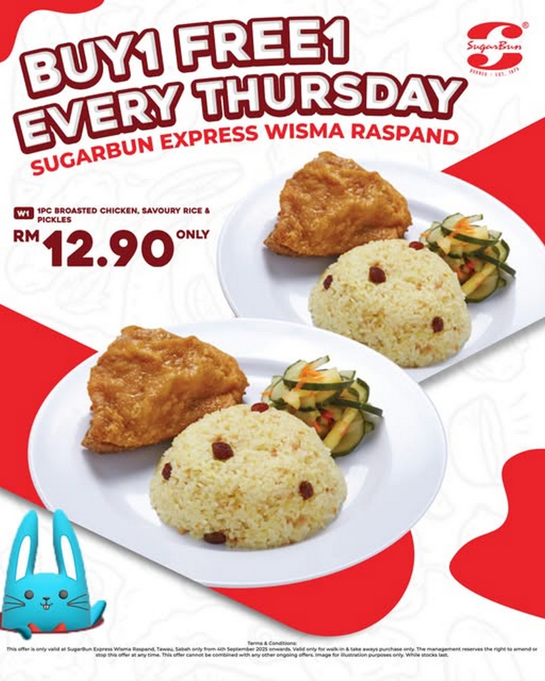 This Thursday-only promotion takes place at SugarBun Express Wisma Raspand in Tawau, and it is one of those offers that immediately catches attention because it combines value, convenience, and the charm of a well-loved menu item. The deal is simple: buy one Broasted Chicken with Savoury Rice and Pickles, and receive another set absolutely free for just RM12.90. For a complete meal, that price point is already impressive, but receiving two meals for the cost of one is what sets this promotion apart. Deals like this are the sort of thing people talk about, especially when they want to stretch their spending without sacrificing quality or flavour.