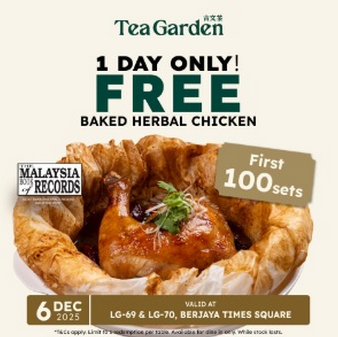 KL food enthusiasts, get ready for a treat! Tea Garden Malaysia is bringing a mouth-watering reason to mark your calendars this 6 December 2025. To celebrate the grand opening of their 49th outlet at Berjaya Times Square, Tea Garden is giving away 100 FREE Baked Herbal Chicken dishes to lucky customers. Yes, you read that correctly — a full set of their signature Baked Herbal Chicken, completely on the house!