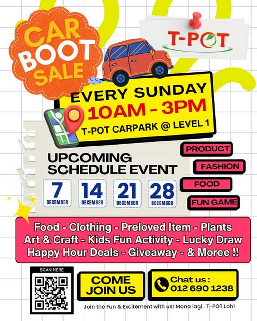 But the fun doesn’t stop with home appliances. Every Sunday in December — specifically on the 7th, 14th, 21st, and 28th — T-POT Kota Kemuning transforms part of their venue into a Carboot Sale, providing a unique shopping experience that feels more like a mini festival than a typical market. The sale runs from 10 AM to 3 PM on these days, giving plenty of time to explore, hunt for bargains, and soak in the lively atmosphere.
