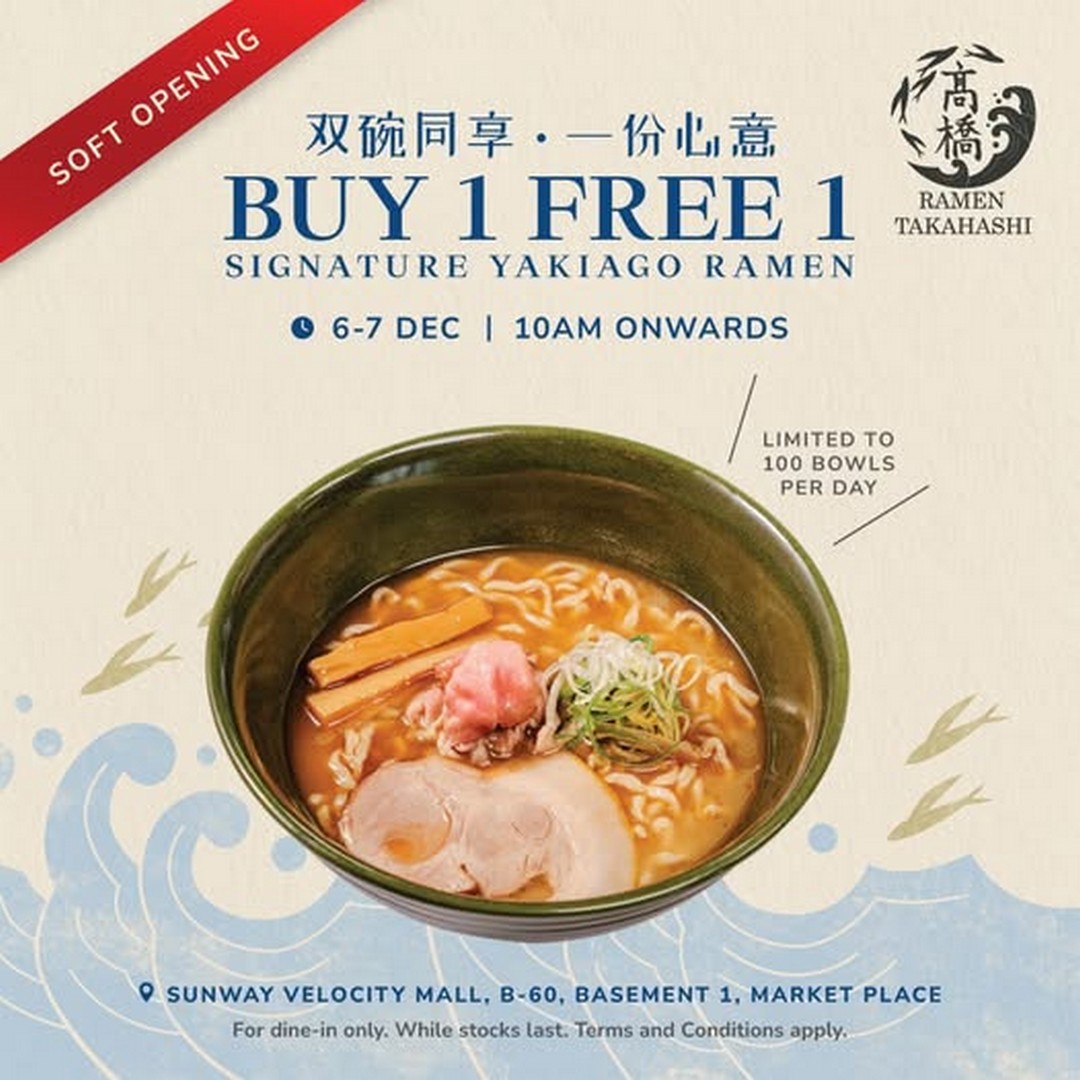 In summary, this soft opening promotion at Ramen Takahashi is more than just a meal deal—it’s a celebration of Japanese culinary artistry, a chance to enjoy high-quality ramen at great value, and an opportunity to discover a new favourite dining spot. With the Buy 1 Free 1 offer and the limited availability of 100 bowls per day, it’s clear that this is a promotion designed to reward early visitors. For anyone who appreciates good food, wants to try authentic Niigata-style ramen, or simply loves a great deal, Ramen Takahashi is a must-visit this 6th and 7th of December.
